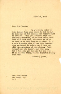 [006] March 26, 1926. To Mrs. Turner from EZ (Zande), asking her to fill out the enclosed permission blank for Polly’s tonsillectomy in May. “It is a more favorable time of year than November when we planned it before….”