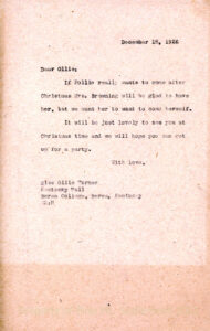 [007] December 15, 1926. To Miss Ollie Turner, Berea College, Berea, KY, from EZ (Zande). “If Pollie (sic) really wants to come after Christmas Mrs. Browning will be glad to have her….” Mrs. Zande hopes to see Ollie at Christmas.