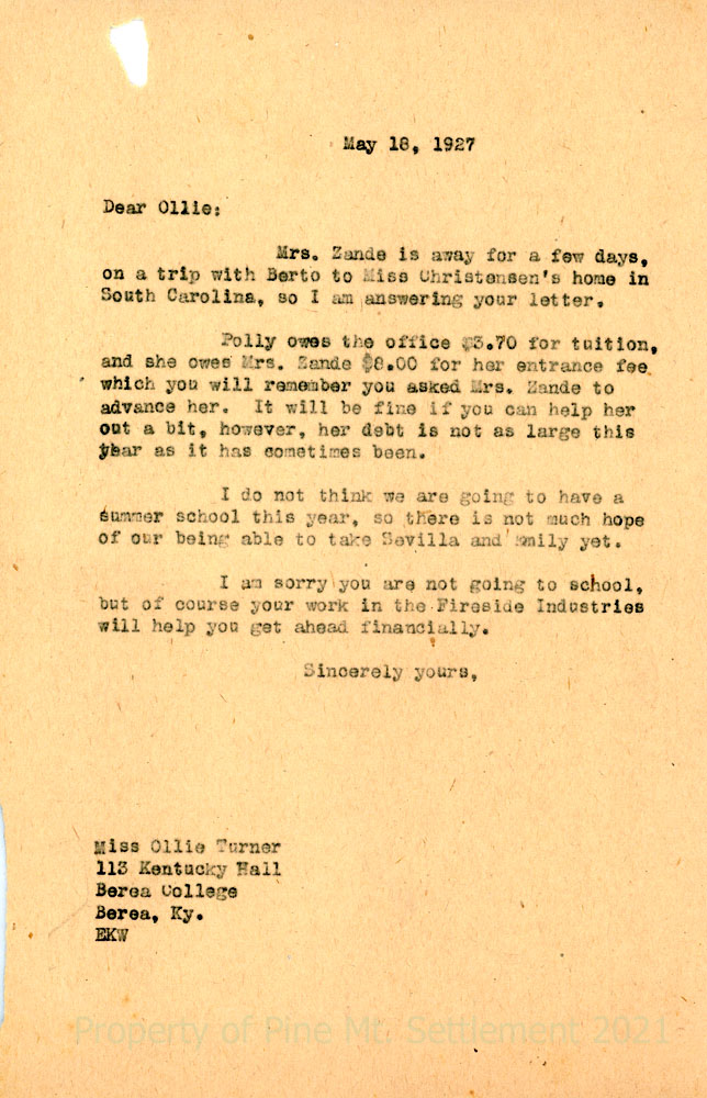 [008] May 18, 1927. To Ollie from EKW (Evelyn K. Wells), explaining she is writing because Mrs. Zande is visiting Miss (Abbie) Christensen in South Carolina. Asks that Ollie help with Polly’s debts for tuition and entrance fee. There may not be a summer school this year, so will probably not take Sevilla and Emily yet. “I am sorry you are not going to school, but of course your work in the Fireside Industries will help you get ahead financially.”