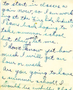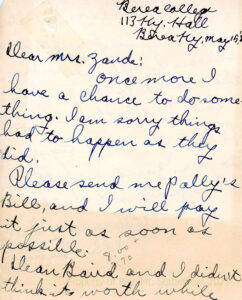 [009] through [009b] N.D. Three-page letter to Zande from Ollie, who offers to pay Polly’s bill. Dean (W.J.) Baird and she “didn’t think it worthwhile to start in classes now, so I am working at the Fireside Industries.” Asks if PMSS could take Sevilla and Emily, offering to pay what she can for their entry.