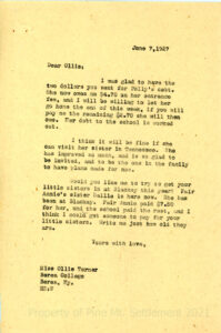 [013] June 15, 1927. To Ollie from EZ (Zande), who is pleased she could pay all of Polly’s debt. “I am always glad when a child can be relieved from the feeling of hopelessness it has when it takes too many weeks to work off a debt.” Zande is writing to Blackey about Sevilla and Emily.