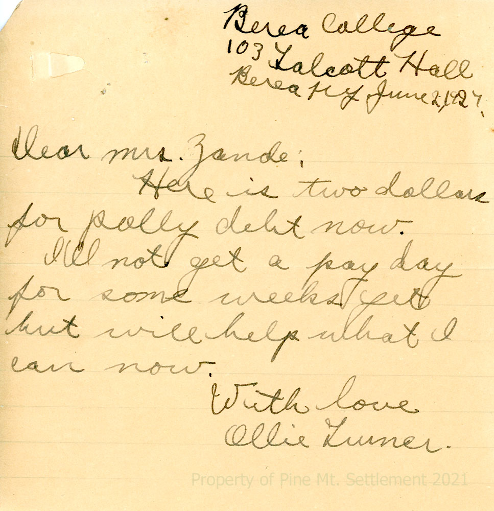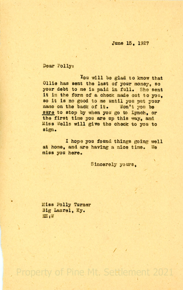 [010] June 7, 1927. To Ollie from EZ (Zande), expressing appreciation for the payment of Polly’s debt and asks for one final payment. Zande gives her okay for Polly to visit her sister in Tennessee. Offers to try to get “your little sisters in at Blackey this year.” Tells about Fair Annie’s sister Sallie from Blackey, now at Pine Mountain.