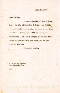 [014] June 25, 1927. To Polly from EZ (Zande), offering “a bundle of some things” for her little sisters, which she can pick up if she’s coming to PMSS on July 4.