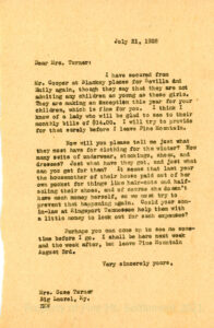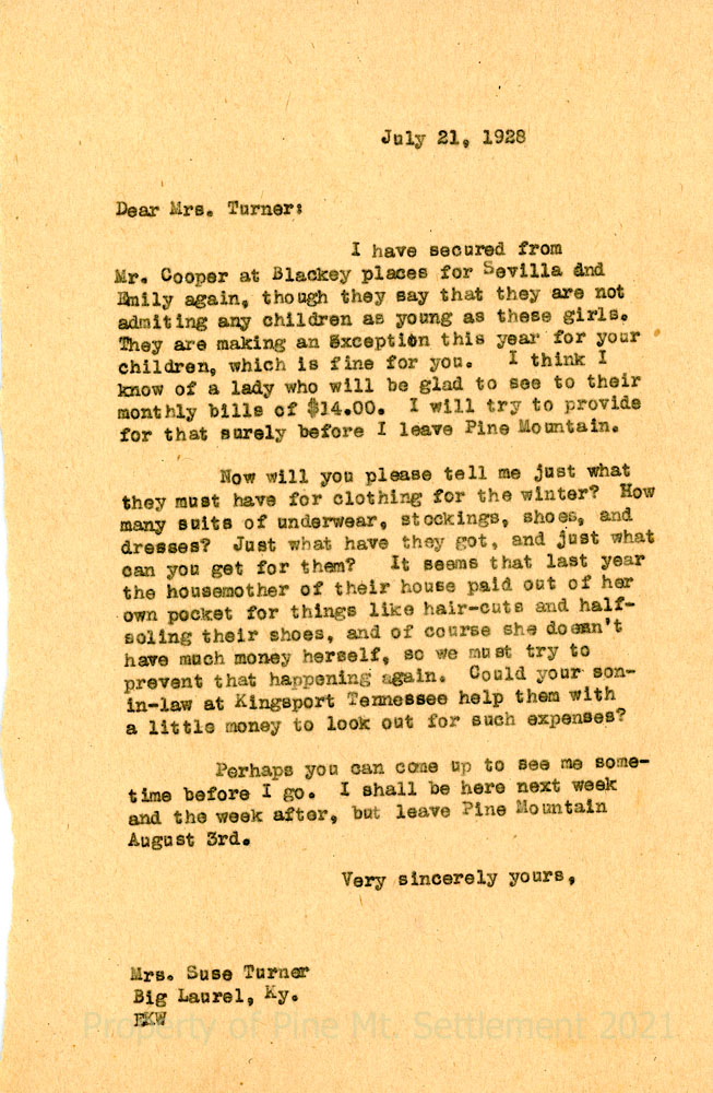 [017] July 21, 1928. To Mrs. Suse Turner from EKW (Wells), reporting that she has secured places at Blackey for Sevilla and Emily again. She thinks she knows a lady who will pay their monthly bills. Asks what kind of winter clothing the girls will need and whether her son-in-law at Kingsport, TN, could help with expenses. Wells hopes Mrs. Turner will visit PMSS before Wells leaves PMSS on August 3.