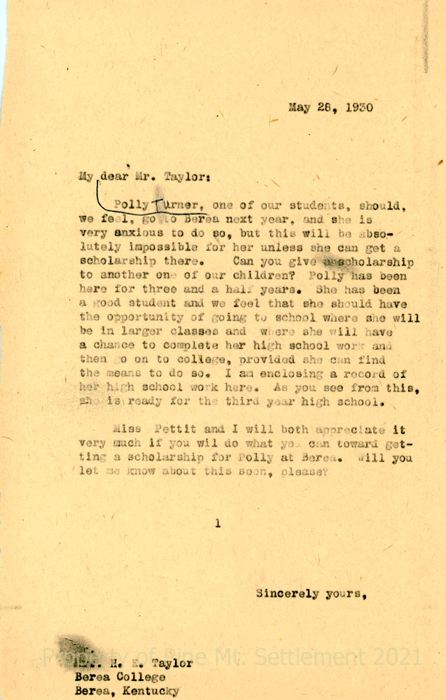 [021] May 28, 1930. To Mr. H.E. Taylor, Berea College, from (? truncated, apparently Melville), asking him to get Polly Turner a scholarship and explaining her circumstances. “Polly has been here for three and a half years (sic) … a good student and we feel that she should …be in larger classes and …will have a chance to complete her high school work and then go on to college…. [S]he is ready for the third year high school.”