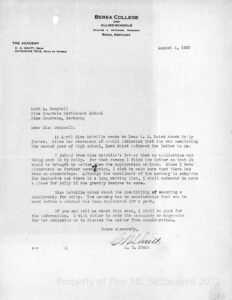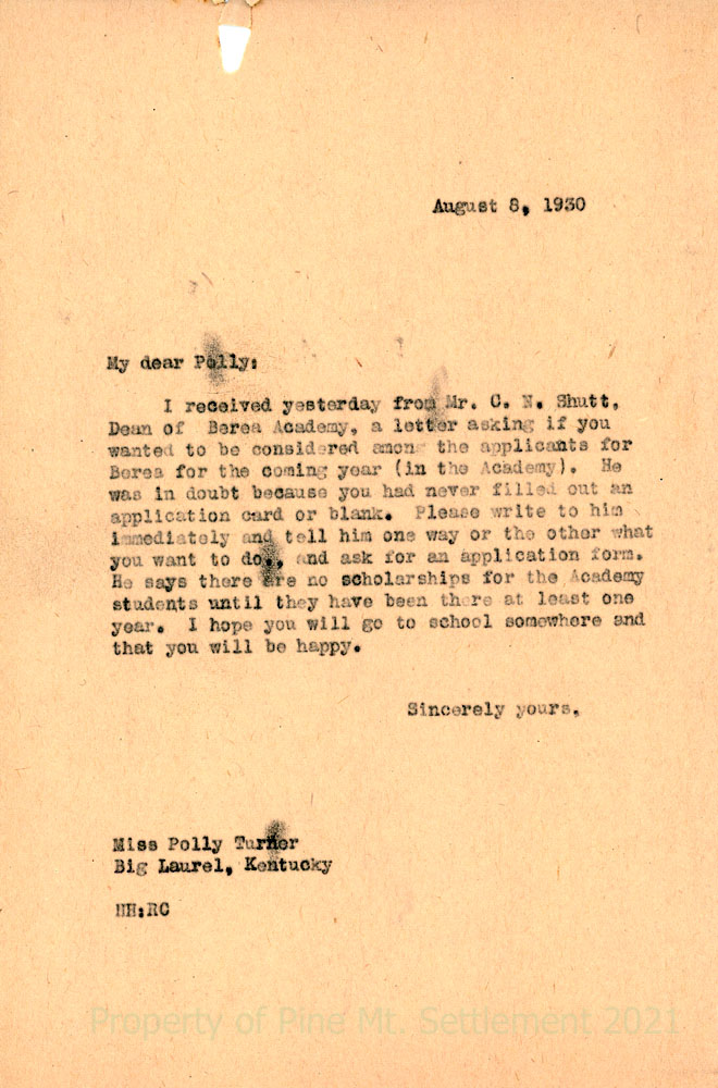 [027] August 8, 1930. To Mr. C.N. Shutt, Berea College, from RC (Campbell), thanking him for his August 5th letter and asking him to send a Berea College application blank to Polly. Explained that Mr. Taylor’s letter indicated that the Academy was full and therefore Polly probably “had done nothing further about her admission there…. When she left Pine Mountain more than a month ago she told me she would try to apply….through her sister, Olly (sic), who is a student at Berea now.” Campbell will write and ask Polly to apply to Berea immediately for fall entry.