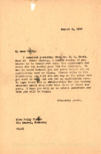 [029] August 8, 1930. To Polly from HH (Hadley), telling her of Shutt’s request that she let him know if she desires to attend Berea Academy and ask for an application form.