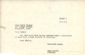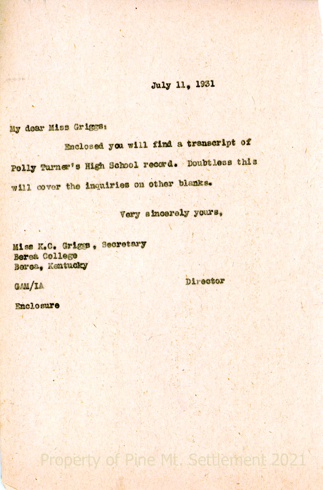 [030] July 11, 1931. To Miss K.C. Griggs, Secretary, Berea College from GAM (Glyn A. Morris), enclosing a transcript of Polly Turner’s High School record.