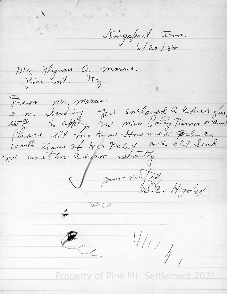 [033] June 20, 1934. To Morris from S.C. Hyder, Kingsport, TN, enclosing $15 for Polly Turner’s account and asked for the balance which he will also pay.