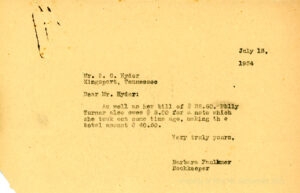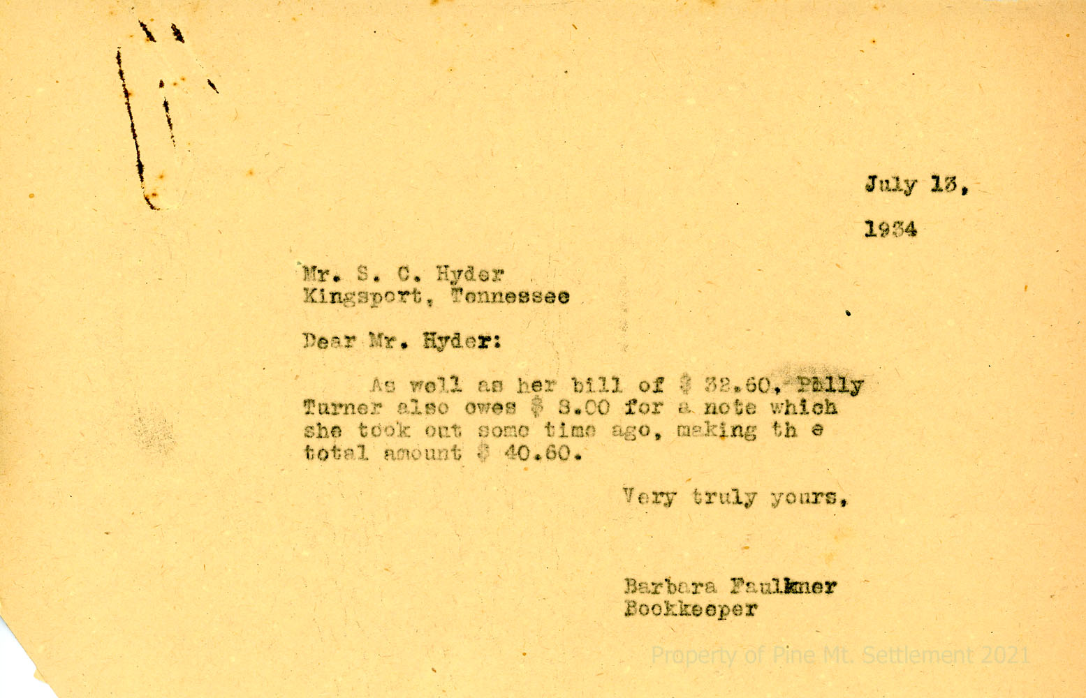[034] July 13, 1934. To Hyder from Barbara Faulkner, Bookkeeper, who provides the balance of Polly’s account: $40.60.
