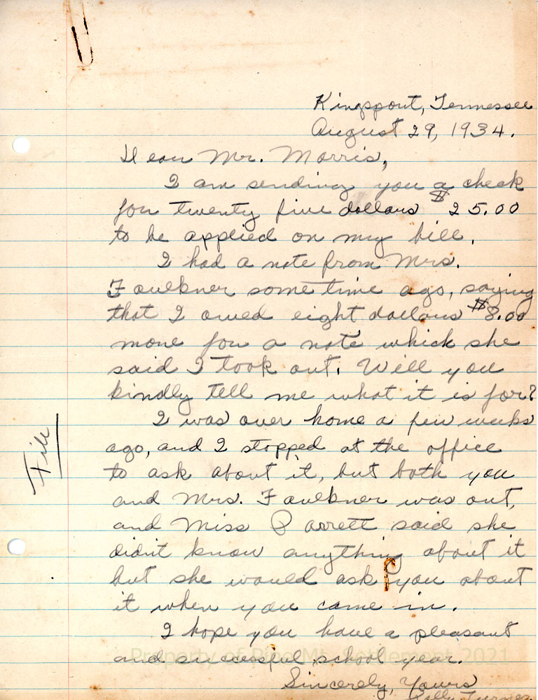 [035] August 29, 1934. To Morris from Polly, Kingsport, TN, sending $25 to apply to her bill; asked about an $8 note that Faulkner said she took out.