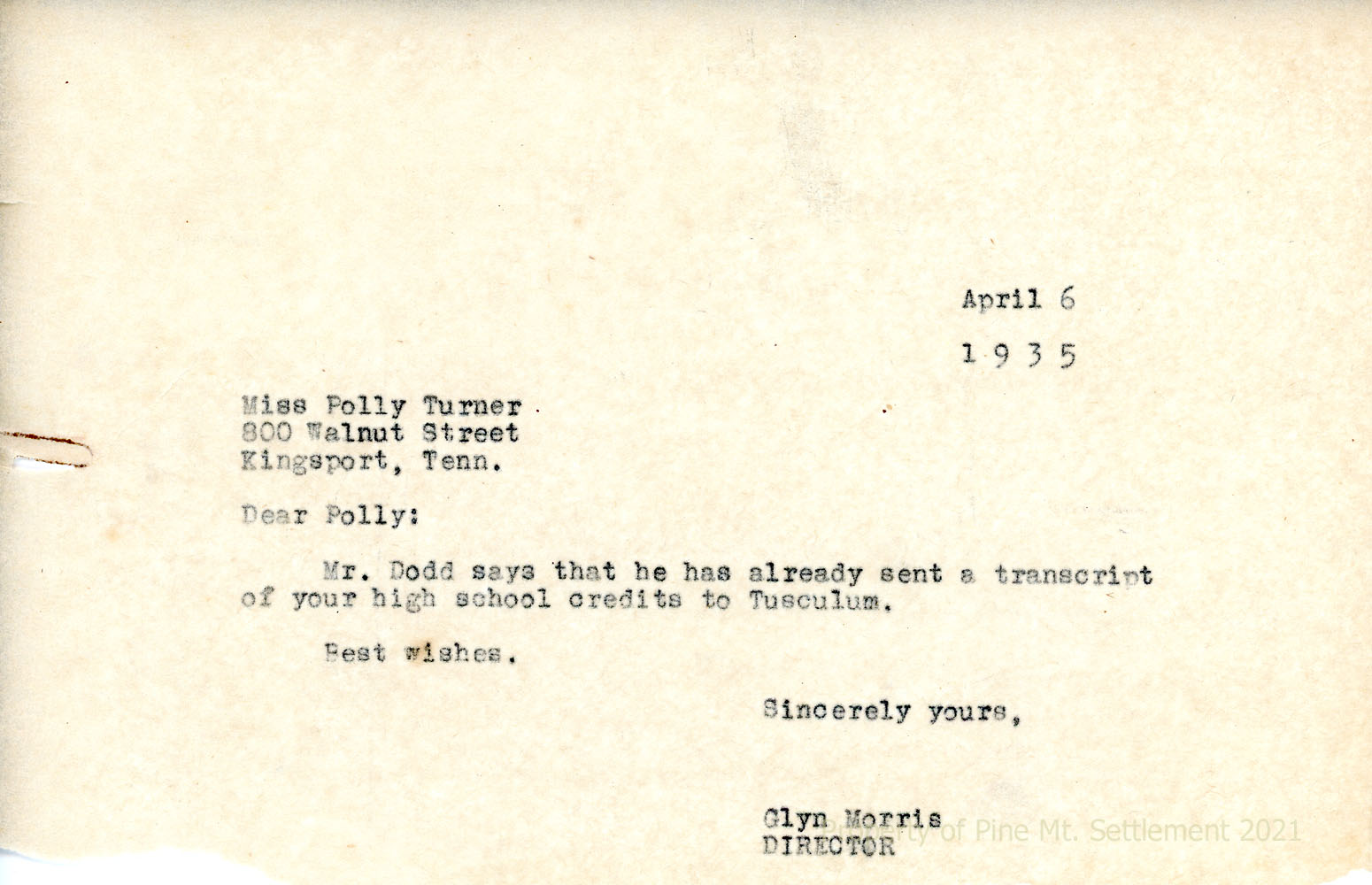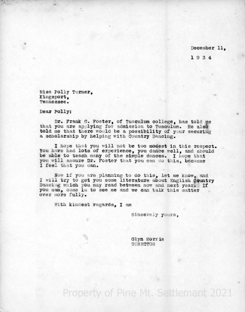 [037] December 11, 1934. To Polly from Glyn Morris, Director. “Dr. Frank C. Foster, (Dean) of Tusculum College, has told me that you are applying for admission to Tusculum….[and of the] possibility of your securing a scholarship by helping with Country Dancing.” Morris encourages Polly to assure Foster that she “had lots of experience, (dances) well, and should be able to teach many of the simple dances.” Morris offers to send literature about English Country Dancing and to meet with her and discuss the matter more fully.