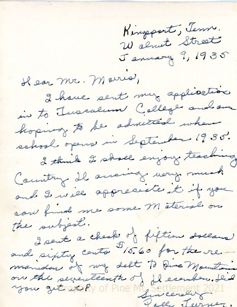 [040] January 9, 1935. To Morris from Polly, reporting that she sent her application to Tusculum College and hopes to begin there in September 1935; will enjoy teaching Country Dancing and asks for the material on the subject; has sent a check for $15.60 to cover the rest of her debt.