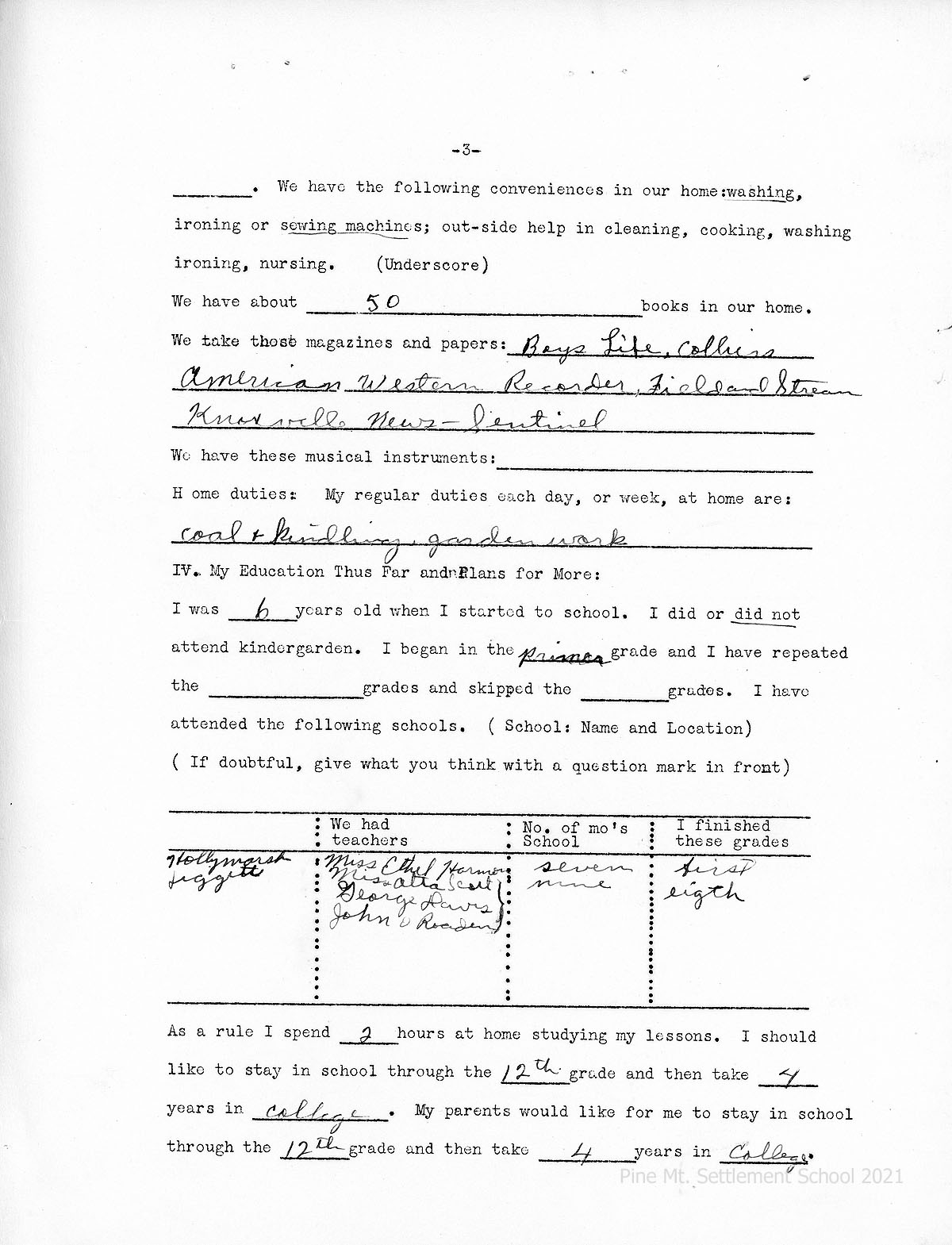 We have about 50 books in our home. We read Boy’s Life, Colliers, American Western Recorder, Field and Stream, Knoxville New-Sentinel.