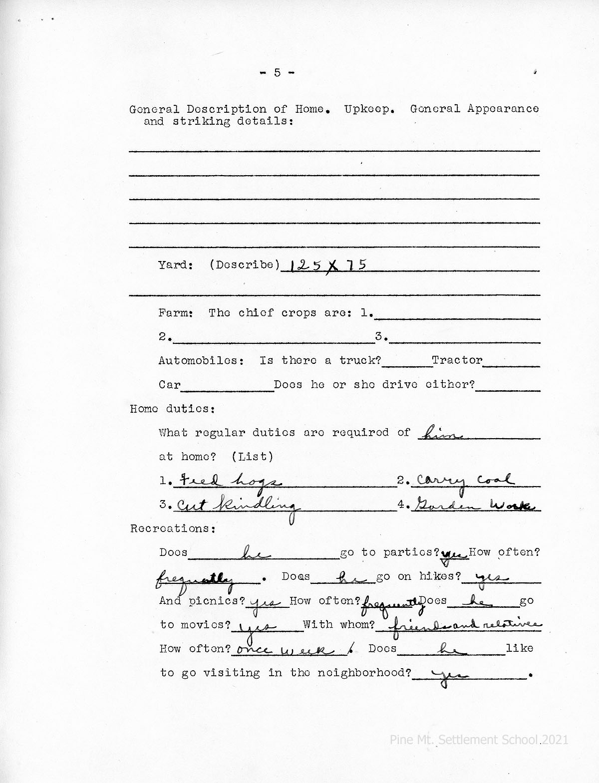 [03d] HOME AND PARENTS RECORD, page 5, Home and Recreations, continued. William Tye’s duties: Feed hogs, cut kindling, carry coal, garden work.
