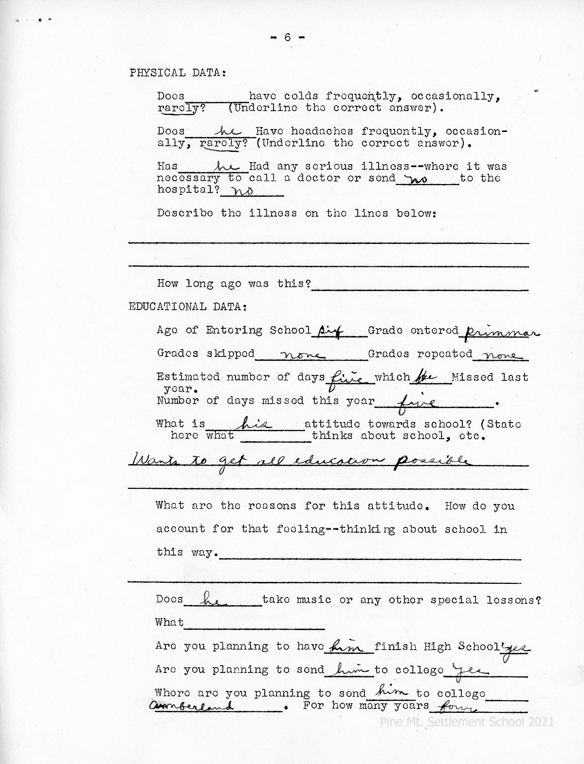 [03e] HOME AND PARENTS RECORD, page 6, Physical and Educational Data. William Tye’s attitude towards school: Wants to get all education possible. Where are you planning to send Tye to college? Cumberland.