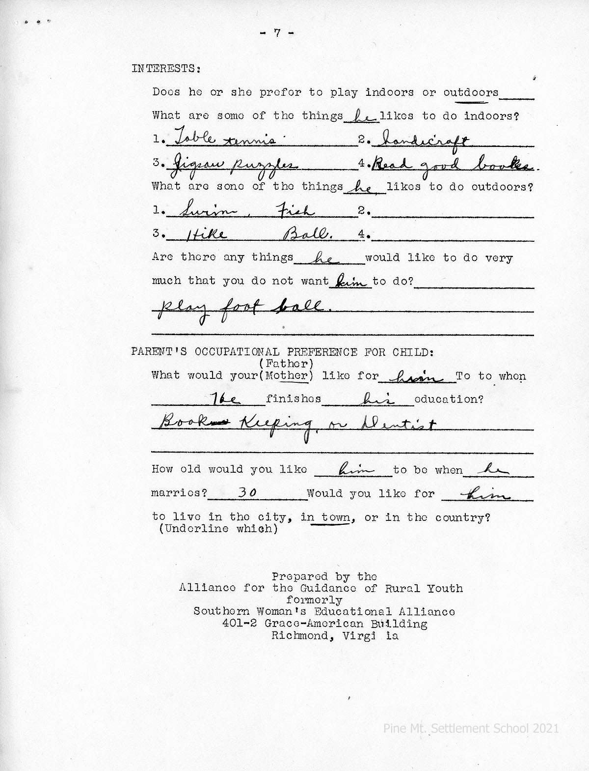 [03f] HOME AND PARENTS RECORD, page 7, Indoor interests: Table tennis jigsaw puzzles, handcraft, read good books. Parent’s occupational preference: Bookkeeping or Dentist. See also [02c]