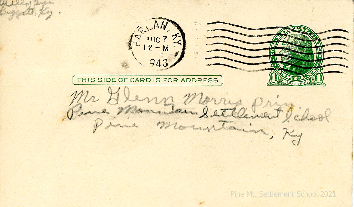 [04] August 7, 1943 (postmark). Address side of postcard to Mr. [Glyn] Morris, PMSS, from Billy Tye, Liggett, KY.