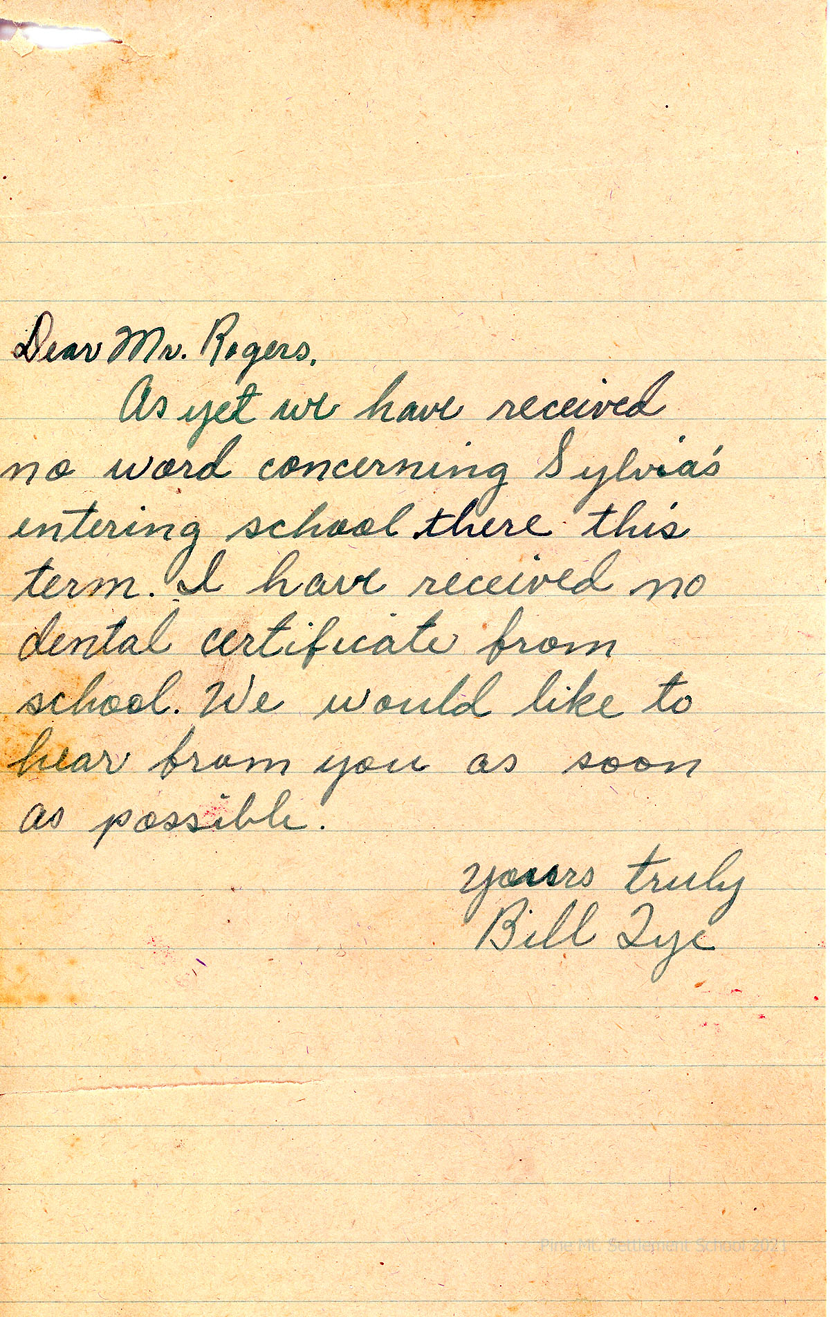 [11] N.D. To Mr. [Burton] Rogers from Bill Tye, asking about Sylvia [Rose Tye]’s entering PMSS; has received no dental certificate.