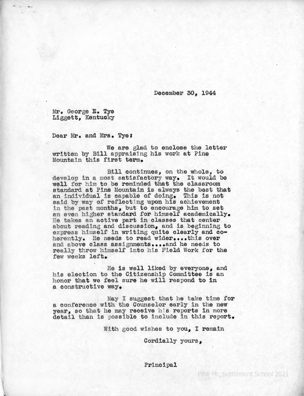 [12] December 20, 1944. To Mr. and Mr. George E. Tye from [unsigned, likely Arthur Dodd], Principal, enclosing “the letter written by Bill appraising his work at Pine Mountain this first term. … Bill continues, on the whole, to develop in a most satisfactory way” but should remember that the PMSS standard “is always the best that an individual is capable of doing…. [He] should set an even higher standard for himself academically… He is well liked by everyone and his election to the Citizenship Committee is an honor….” Suggests a conference with the Counselor for more details.
