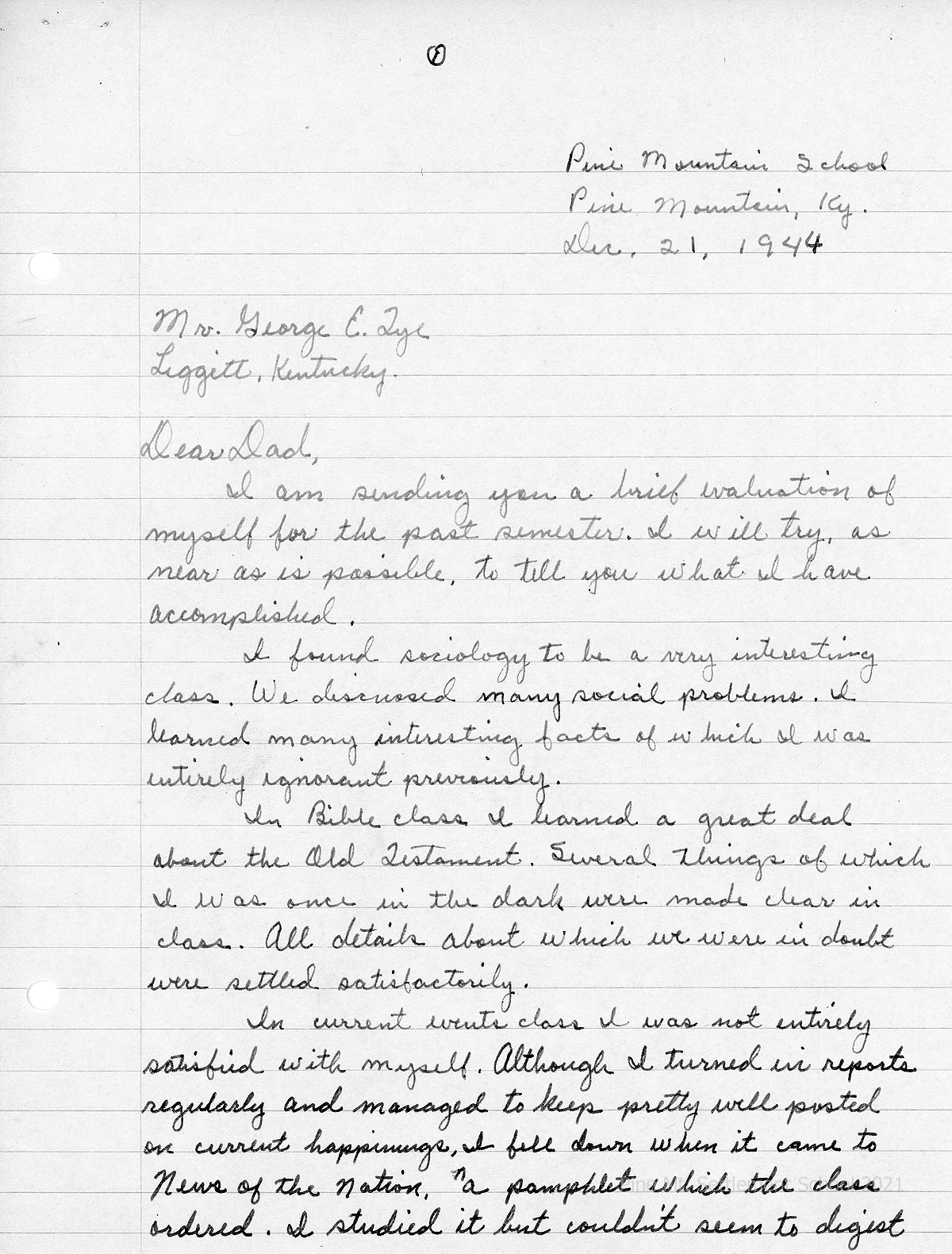 [06] December 29, 1943. To Earl Tye, Liggett, KY from [unsigned, likely Arthur Dodd], Principal, providing “a brief supplement to Billy’s letter” with quotes from the teacher’s report about his performance in English: “Billy is an excellent student. He has read widely and has a richer vocabulary and a better style than anyone in the class. He also shows mature insight and judgment. He is always interested and alert…..” Also, assessments of his work in Miss Hill’s classes (“excellent”), music (“fairly good”), and biology (“somewhat inconsistent”). The Principal explains why Tye was taken out of Printing class. “He has made a very fine adjustment to live at Pine Mountain and is responding in a satisfactory way to all of its offerings.” Comments on Tye’s potential.
