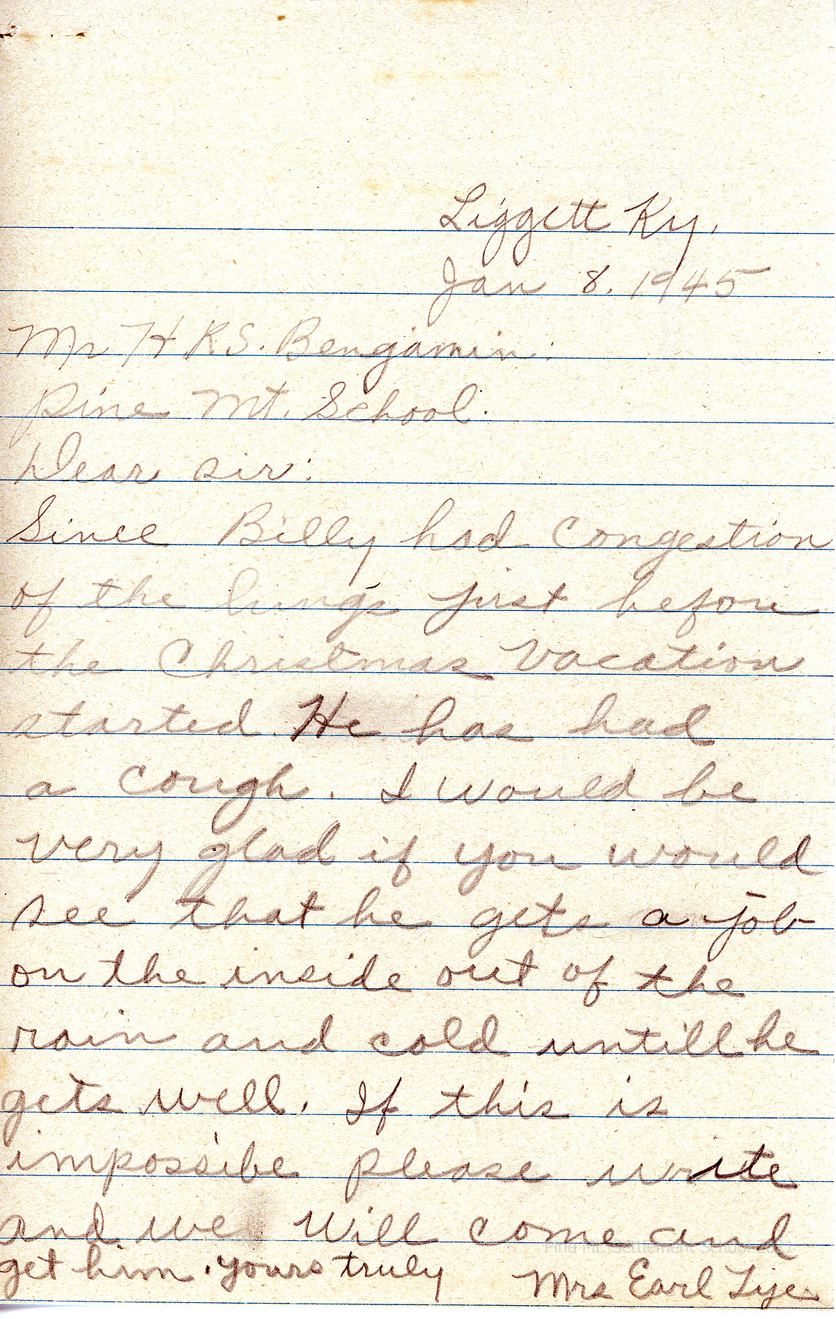 [15] January 8, 1945. To H.R.S. Benjamin from Mrs. Earl Tye, asking that Billy, since he had lung congestion, “gets a job on the inside out of the rain and cold until he gets well.”