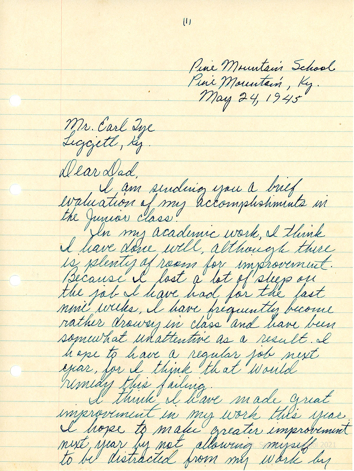 [18] through [18b] May 24, 1945. Three-page letter to “Dad” (Earl Tye) from Bill Tye, sending an evaluation of his accomplishments in the Junior class. Describes what he’s learned on the Citizenship Committee and feels he will be better prepared to deal with the students’ problems on the committee next year. Contrary to public schools, “The students here are bound together by strong cords of harmony and amity. This is very valuable to each student as it has a great deal to do with molding one’s character and making him a better citizen.”