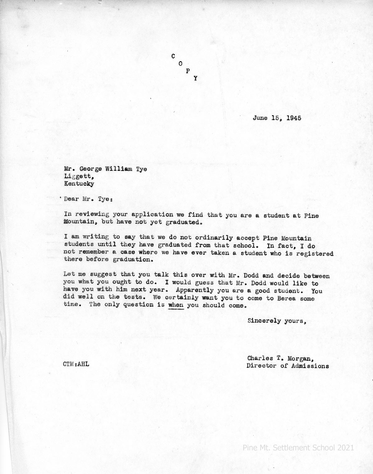 [19] June 15, 1945. Carbon copy of letter to George William Tye from Charles T. Morgan, Director of Admissions, Berea College, declining Bill’s request to be accepted by the college before he graduates PMSS; suggests that Bill discuss this with Mr. Dodd.
