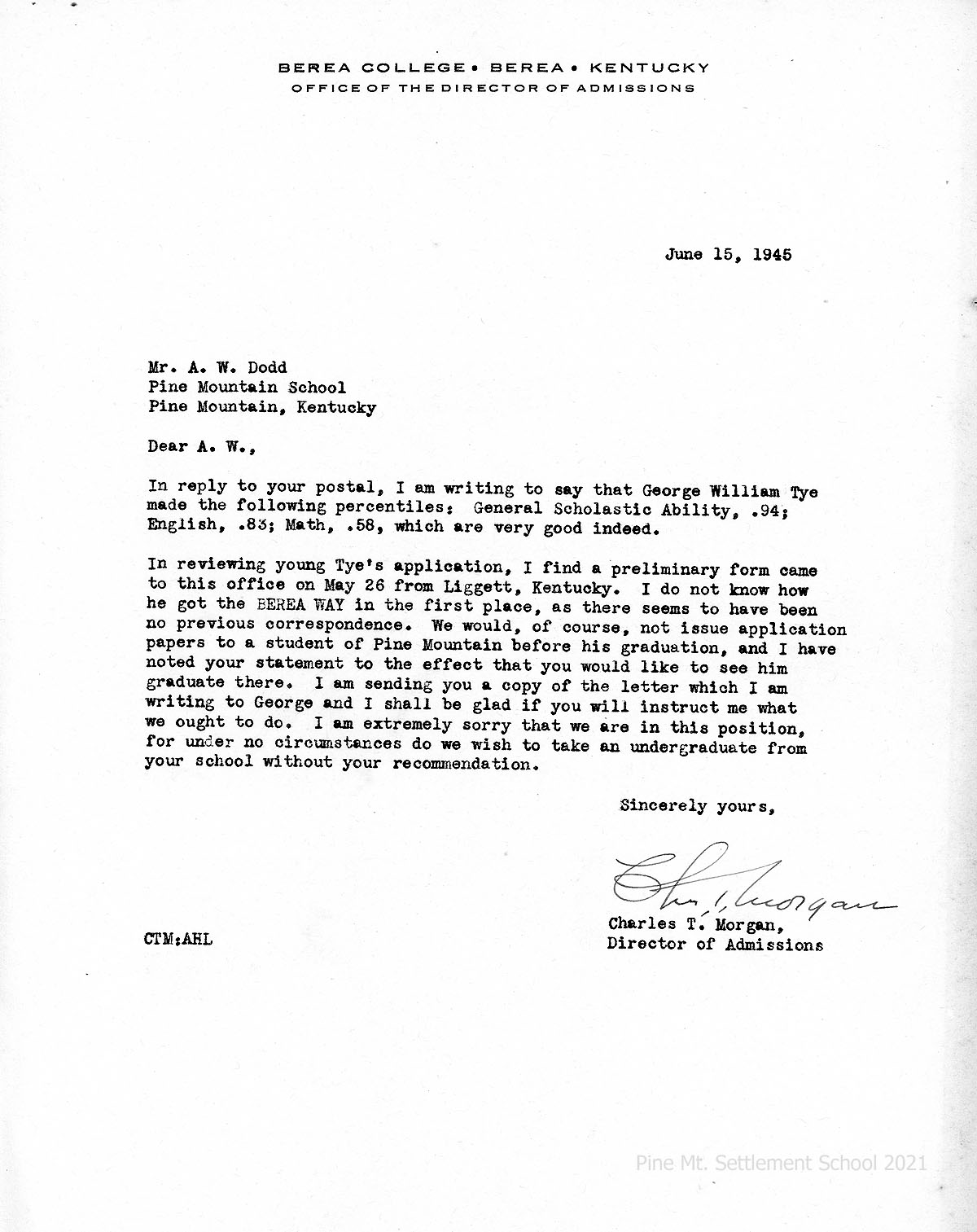 [20] June 15, 1945. To A.W. Dodd, PMSS, from Charles T. Morgan, Director of Admissions, Berea College, enclosing his letter to Bill Tye, asking for advice, and stating “under no circumstances do we wish to take an undergraduate from your school without your recommendation.”