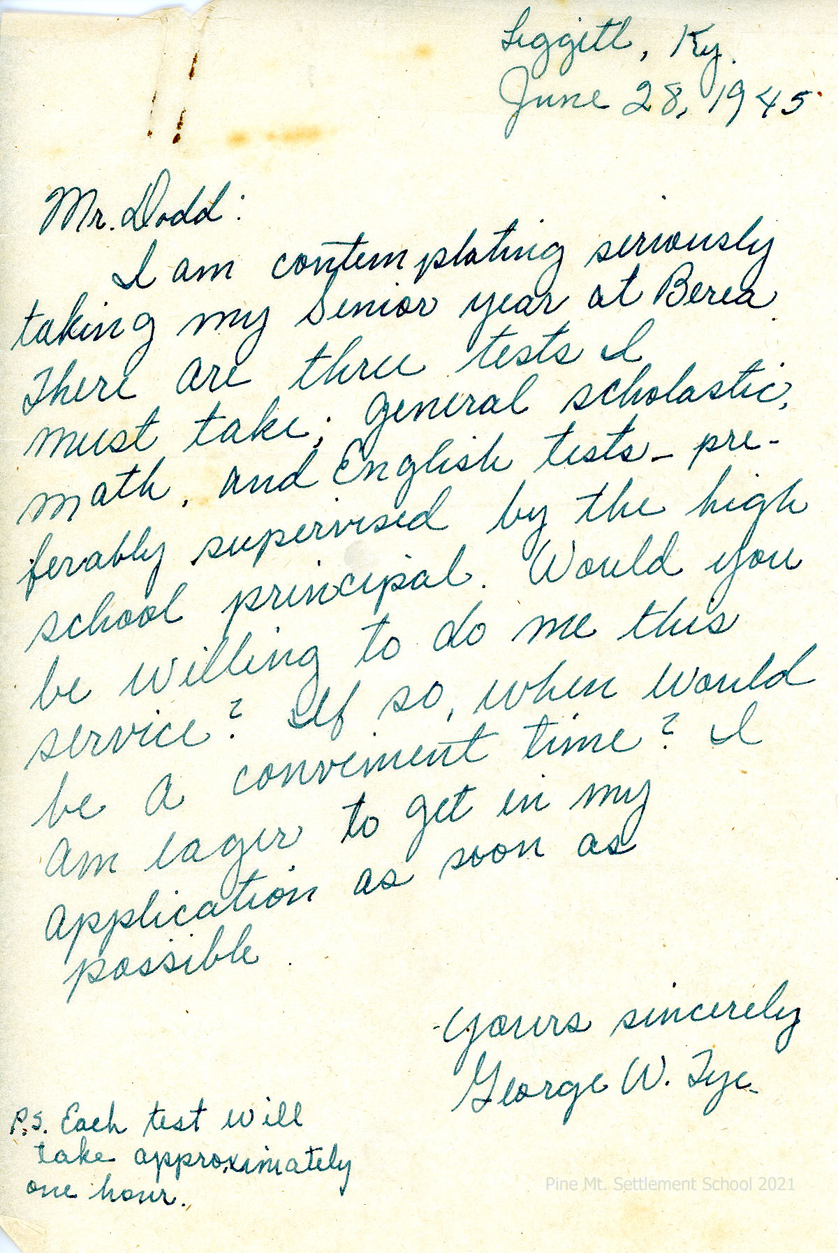 [21] June 28, 1945. To Dodd from George W. Tye. “I am contemplating seriously taking my Senior year at Berea.” Asks Dodd if he would supervise Bill’s taking the necessary three tests: General Scholastic, Math, and English.