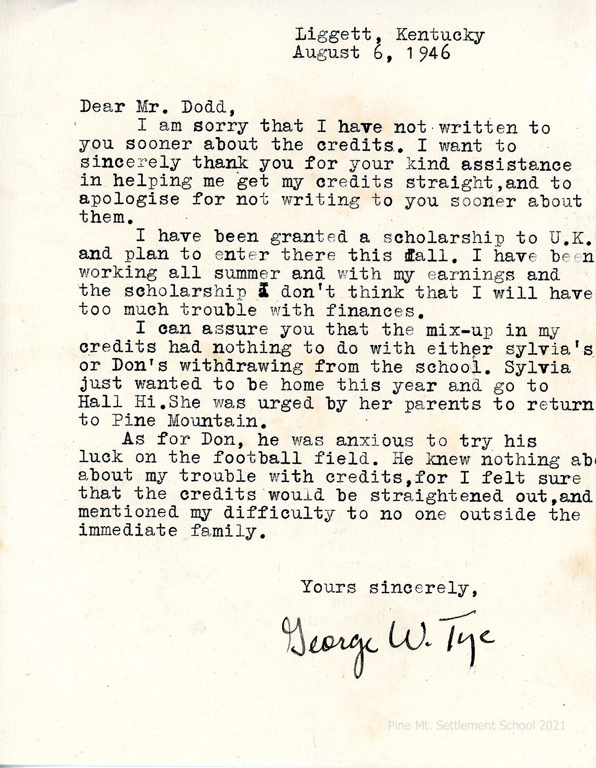 [25] August 6, 1946. Typewritten letter to Mr. Dodd from George W. Tye, who thanks him for assisting with getting “my credits straight.” Reports that he received a scholarship to U.K. and will attend in the fall. “I have been working all summer and with my earnings and the scholarship I don’t think that I will have too much trouble with finances.”