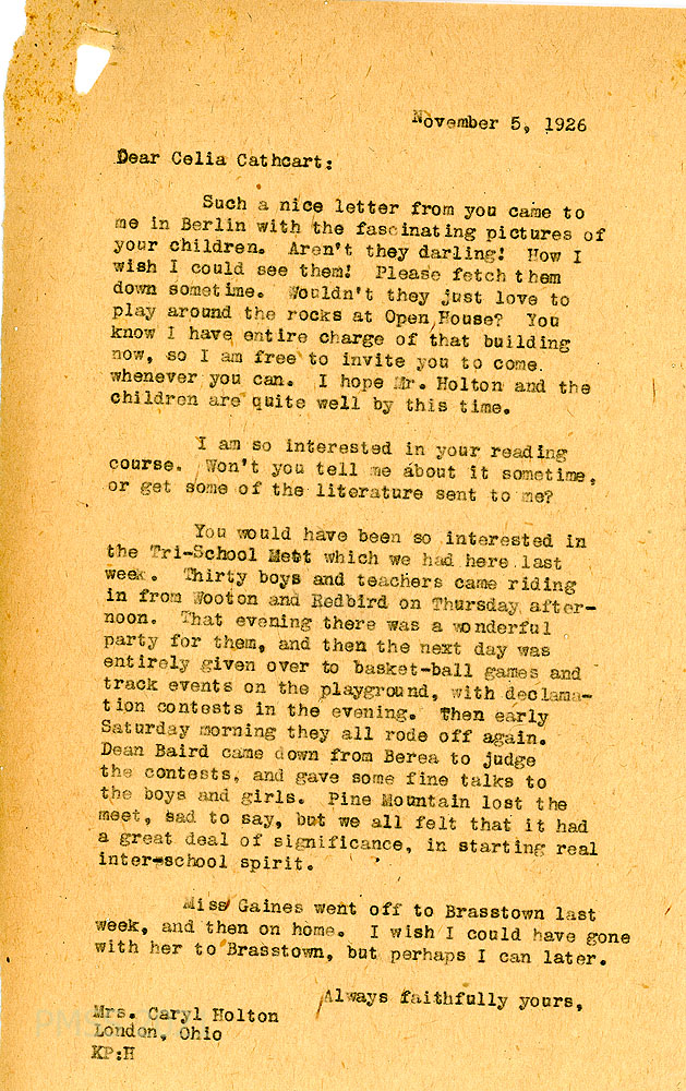 [014] November 5, 1926. To Cathcart from KP (Pettit), who comments on Cathcart’s letter and photos of her children; urges her to visit PMSS. Describes the Tri-School Meet at PMSS last week, consisting of 30 boys and teachers coming from Wooton and Redbird, a party for them, and a day of basketball, track events, and declamation contests in the evening. Dean Baird from Berea College was the judge. Miss Gaines visited Brasstown.