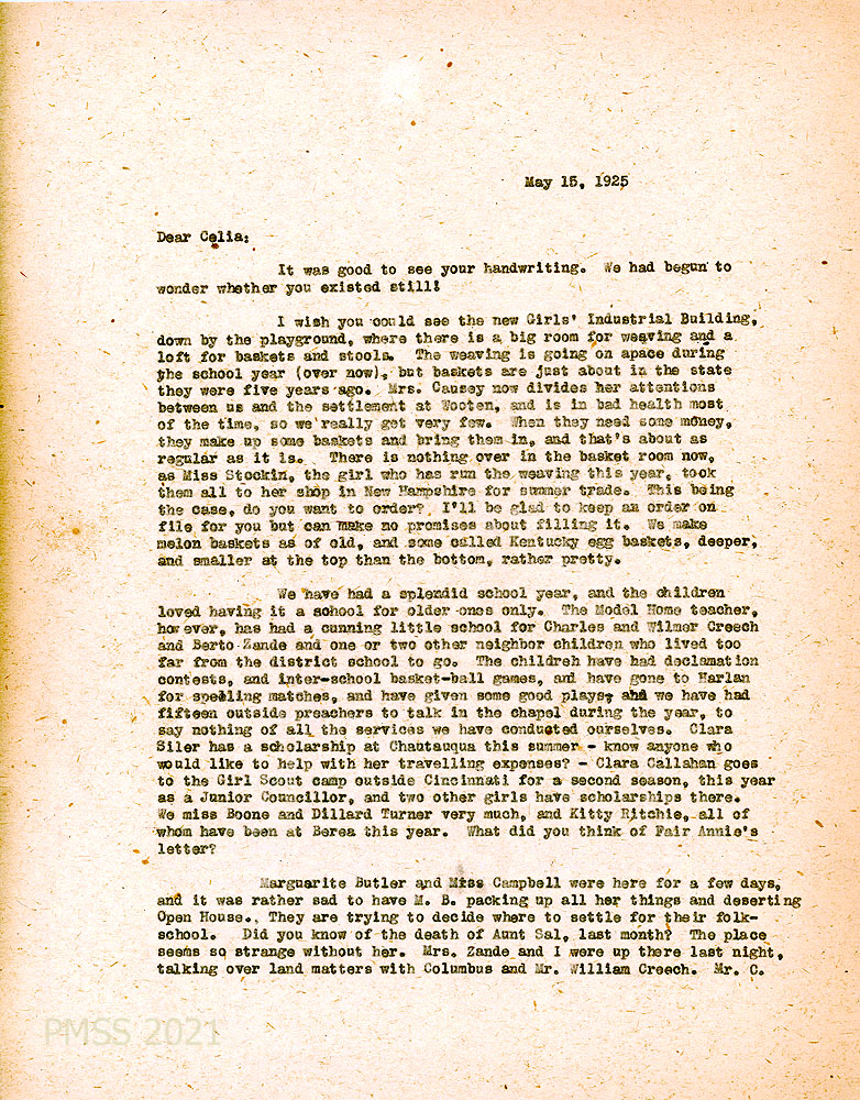 TAGS: Celia Cathcart Correspondence II, Celia Cathcart Holton, Mrs. Caryl Holton, Girls’ Industrial Building, weaving, baskets, little school, student activities, Berea College, Marguerite Butler, folk-schools, Aunt Sally Creech, fundraising for Aunt Sal’s Cabin restoration