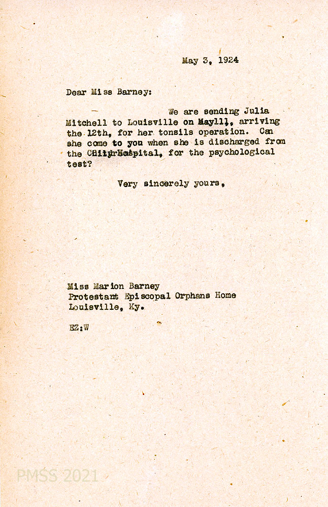 TAGS: Protestant Episcopal Orphan Asylum correspondence 1924, Ethel de Long Zande, Marian Barney, foster homes, foster mothers, medical blanks, psychological tests, tonsils operations, City Hospital in Louisville, whooping cough, Miss Watkins, Children’s Bureau