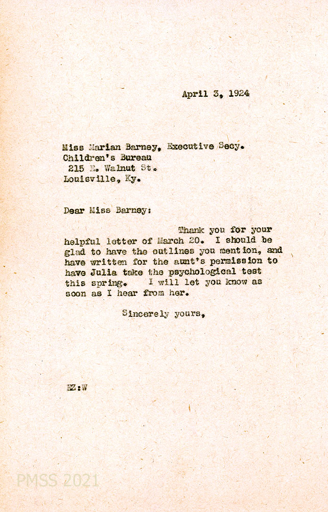 [021] April 3, 1924. To Miss Marian Barney, Children’s Bureau, Louisville, KY, from EZ (Zande), thanking Zande for her March 20th letter. Barney “has written for the aunt’s permission to have J. take the psychological test this spring.”