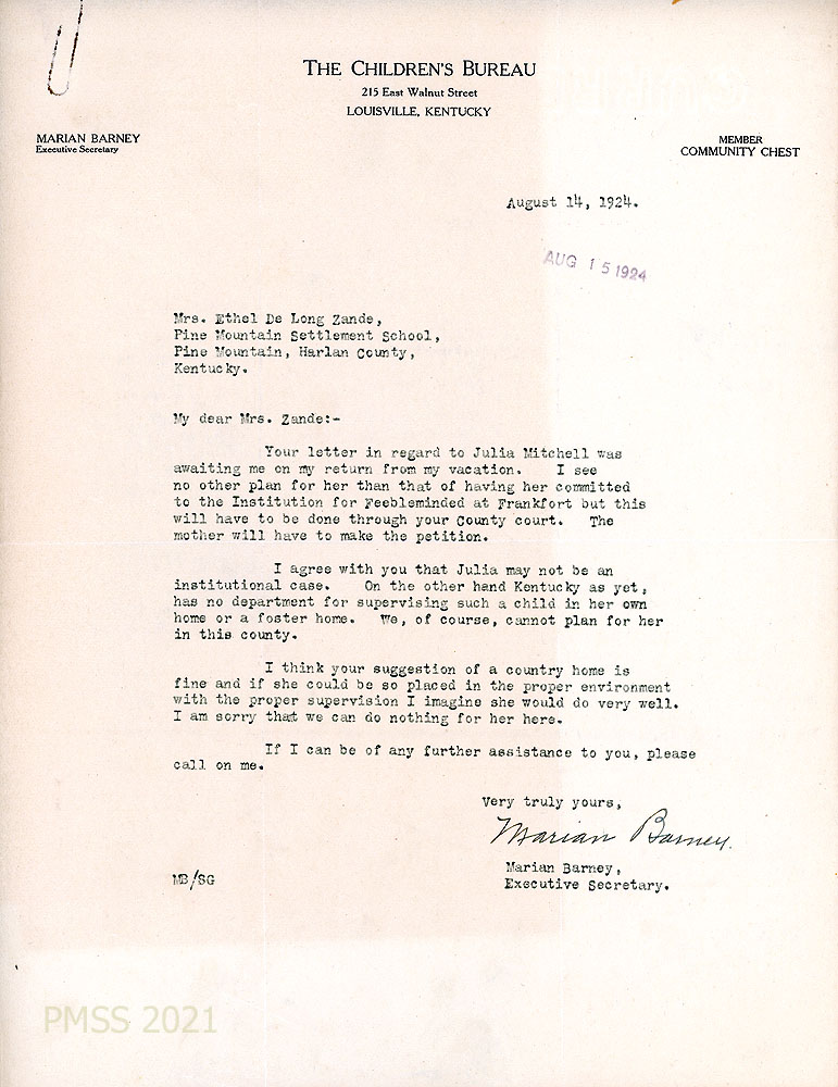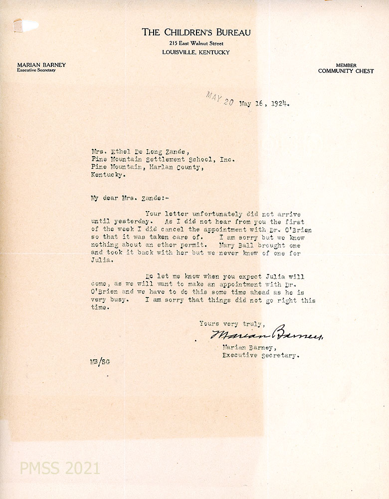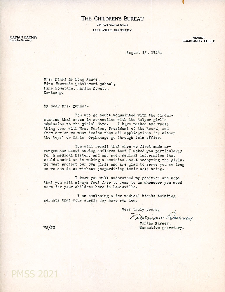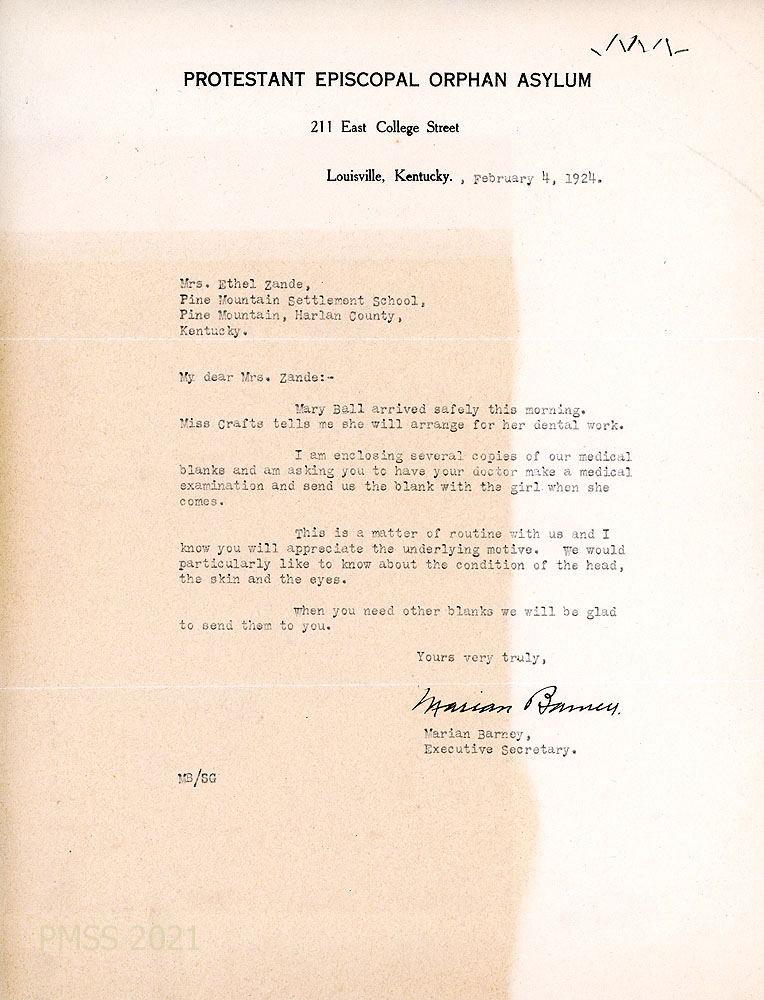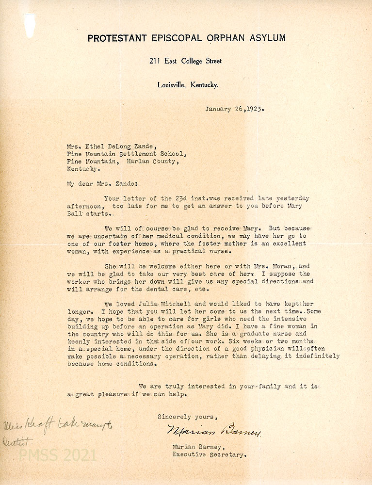 [018] January 26, 1923. (The year given is likely an error and should be 1924). To Ethel de Long Zande from Marian Barney, Executive Secretary, Protestant Episcopal Orphan Asylum, Louisville, KY, responding to Zande’s letter of the 23rd, stating that the Asylum would be “glad to receive M. But because we are uncertain of her medical condition, we may have her go to one of our foster homes, where the foster mother is an excellent woman, with experience as a practical nurse.” Tells how they “loved J.M. …  Some day, we hope to be able to care for girls who need the intensive building up before an operation as M. did….” [Handwritten notation at bottom of letter: “Miss Kraft (sic) take M. to dentist.”]