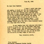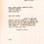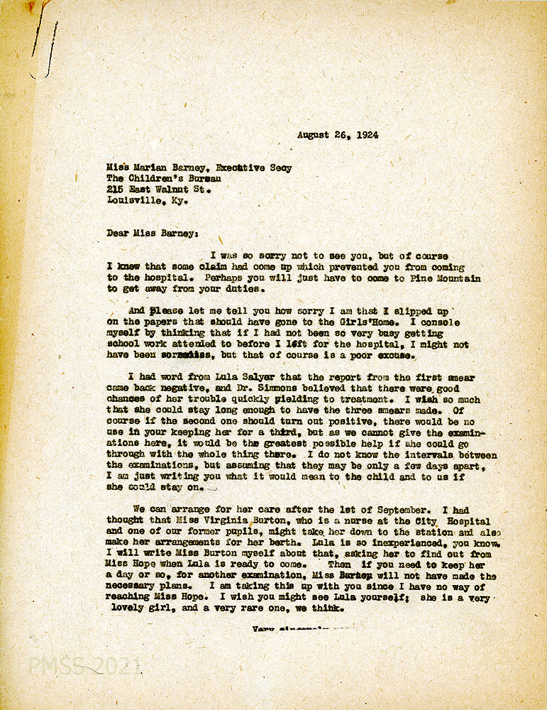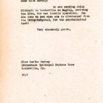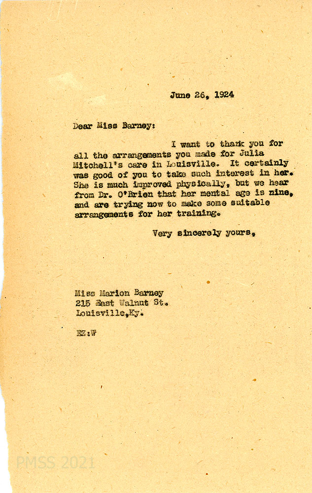 [023] May 3, 1924. To Barney from EZ (Zande). “We are sending J.M. to Louisville….for her tonsils operation. Can she come to you when she is discharged from the City Hospital for the psychological test?”