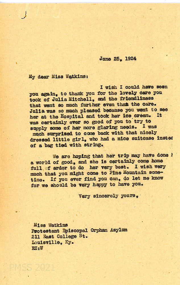 [026] June 25, 1924. To Miss Watkins, Protestant Episcopal Orphan Asylum, Louisville, KY, from EZ (Zande), thanking Watkins for caring for J.M. and tending to “some of her more glaring needs. … We are hoping that her trip may have done a world of good, and she is certainly come home full of ardor to do her very best.”