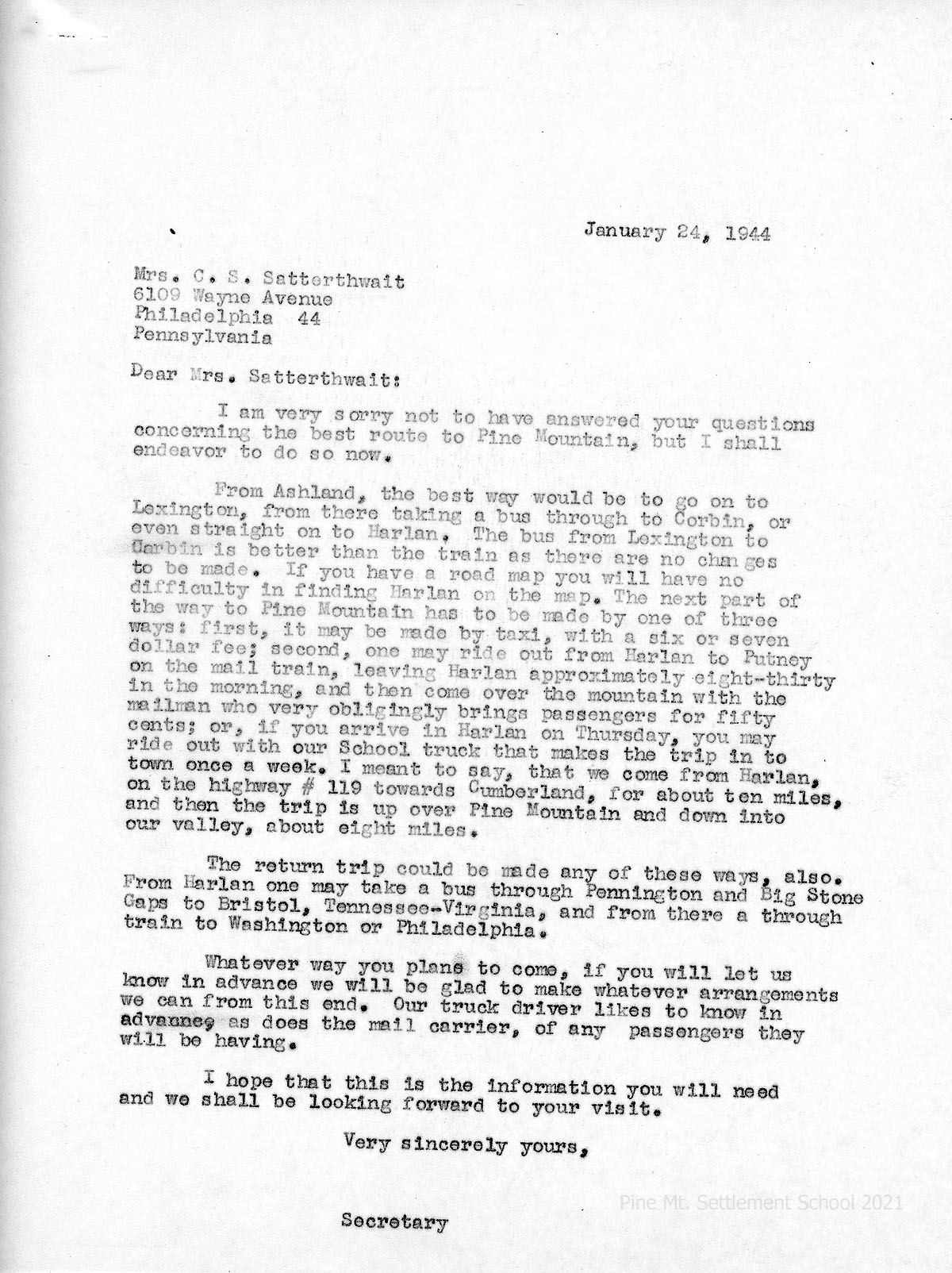 001 January 24, 1944. To Mrs. C.S. Satterthwait, Philadelphia, PA, from (unsigned), Secretary, who provides directions for reaching PMSS: from Ashland via bus to Harlan, then 10 miles on highway 119, then use either a taxi, the mail train, or the School truck to travel 8 miles over the mountain.