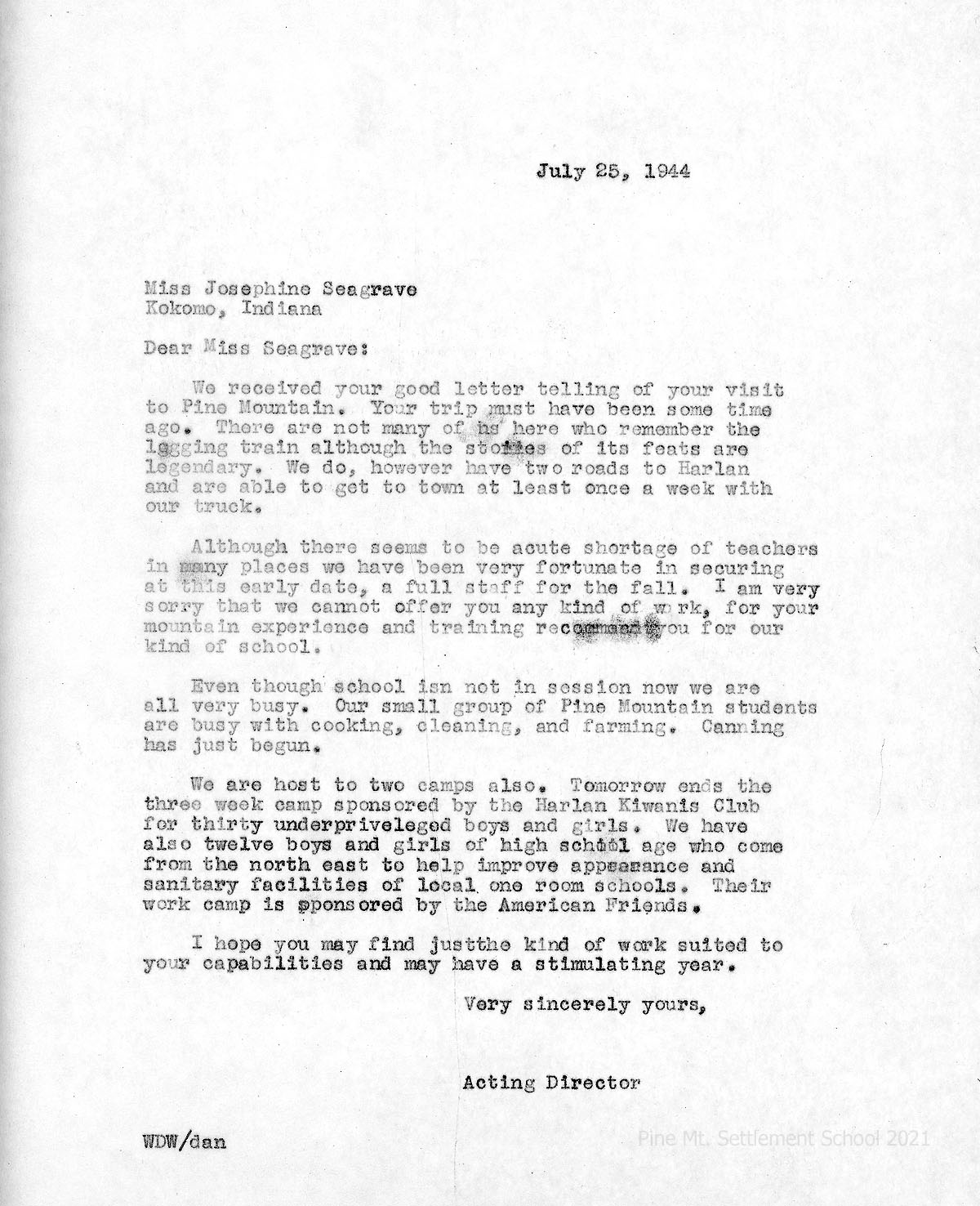 007 July 25, 1944. To Miss Seagrave from Mr. Webb, Acting Director, regretting that the School already has a full staff for fall. Mentions the students’ work and the two camps that PMSS is hosting: Harlan Kiwanis Club for 30 underprivileged children and American Friends’ group of 12 high school students “from the north east to help improve appearance and sanitary facilities of local one room schools.”