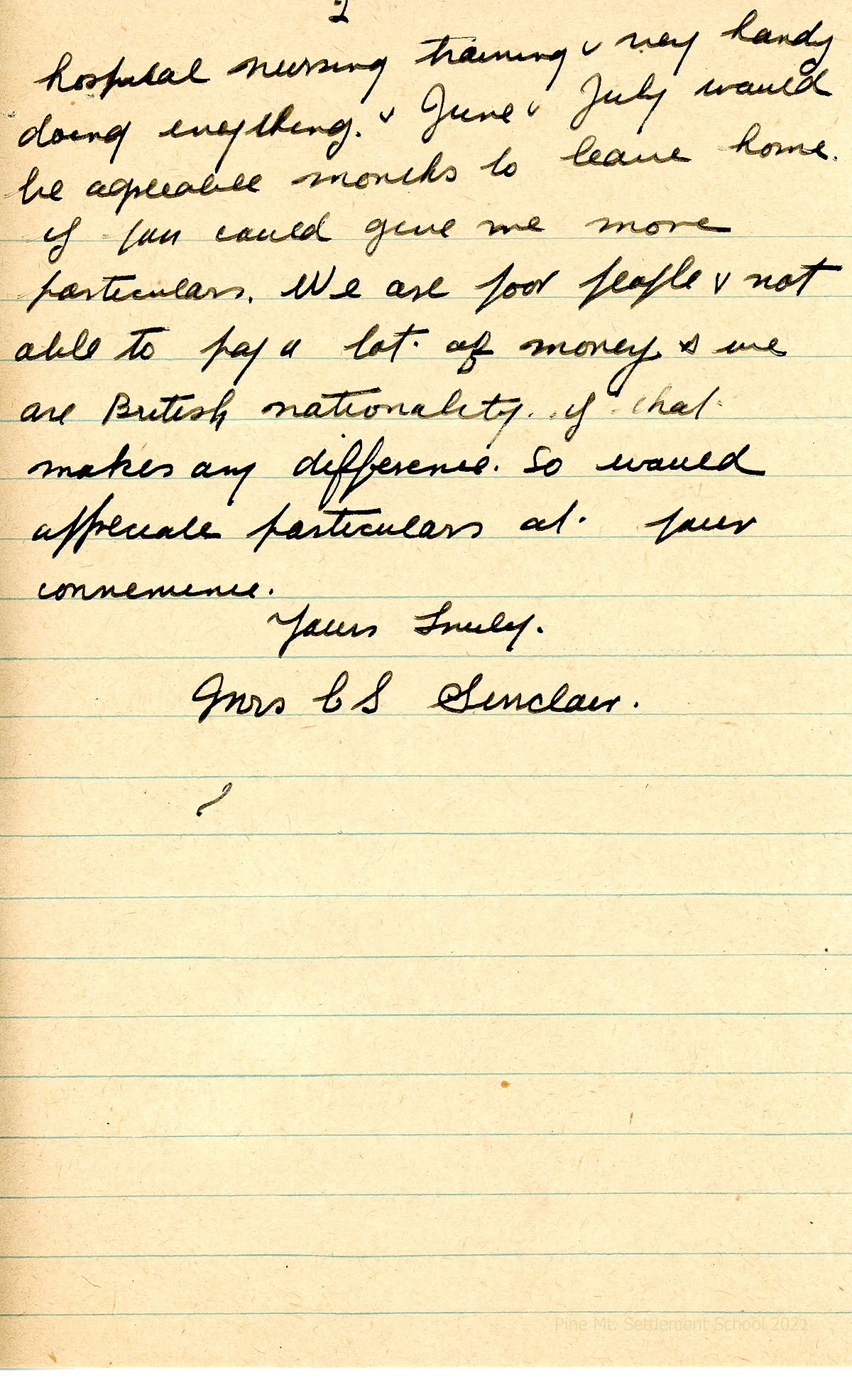 010-010a December 29, 1943. Two-page handwritten letter to Mr. Webb from Mrs. Sinclair, who expresses interest in a June or July visit to join the canning group. Describes her needs and asks for more information.