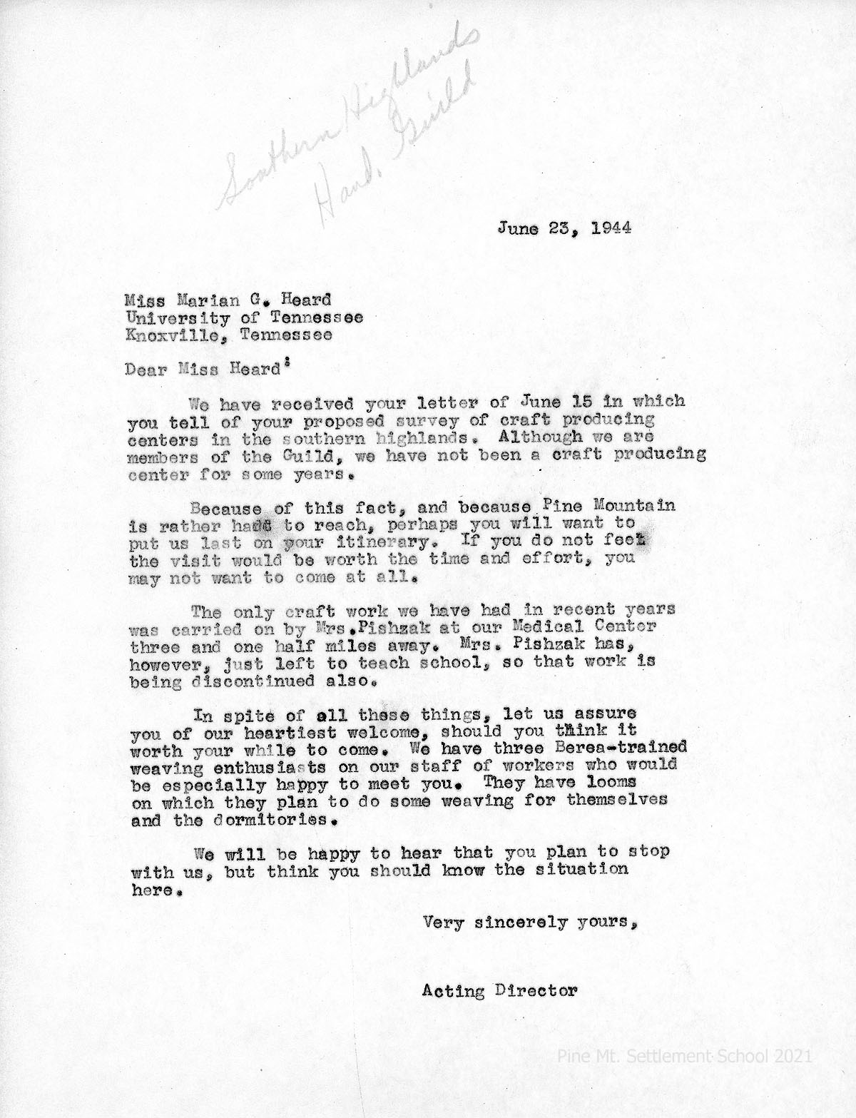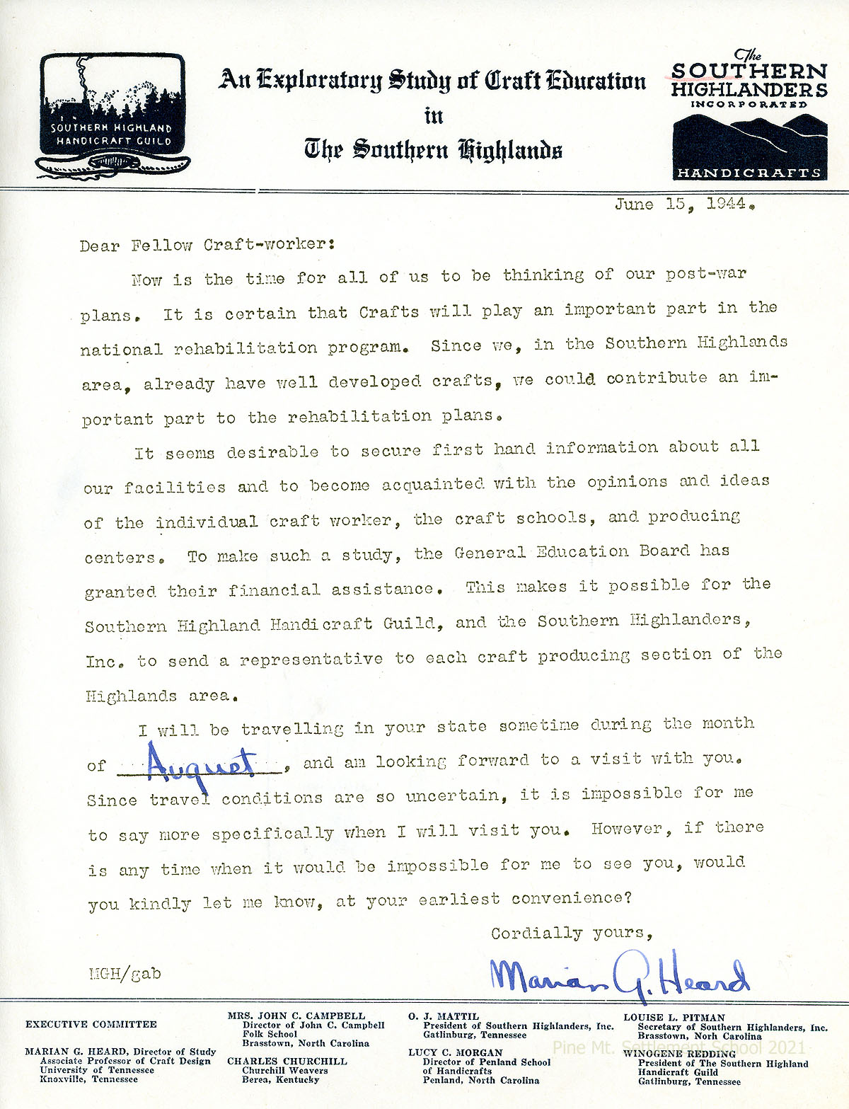 018 June 15, 1944. To “Fellow Craft-worker” from Marian G. Heard on letterhead for the Southern Highland Handicraft Guild and the Southern Highlanders, Inc. “Now is the time for all of us to be thinking of our post-war plans.” The General Education Board has financed a survey of craft workers, schools, and producing centers. Heard, a representative will be visiting PMSS in August.