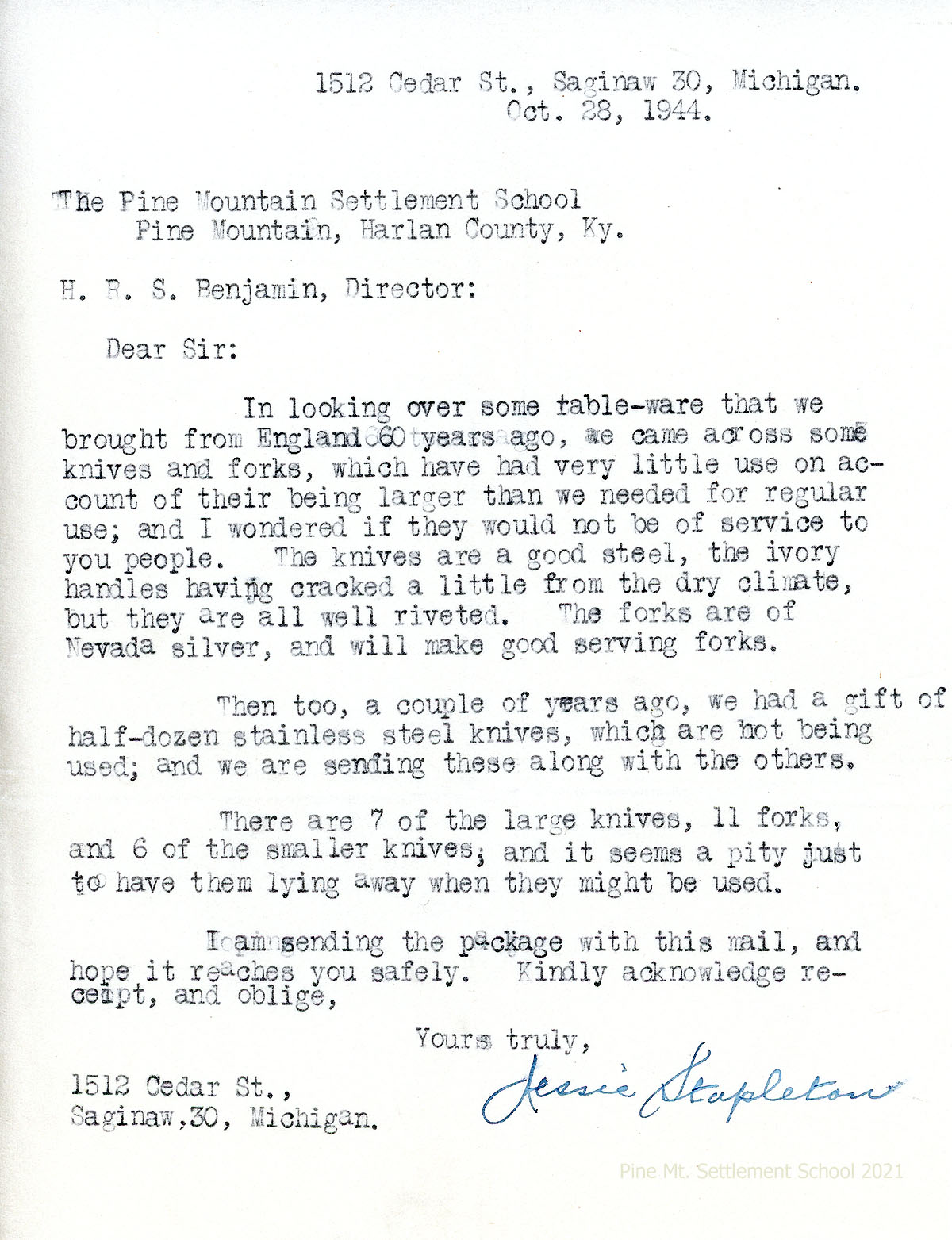 022 October 28, 1944. To Mr. Benjamin from Jessie Stapleton, Saginaw, MI, who is donating 7 large knives, made of steel with ivory handles, 11 serving forks of Nevada silver, and 6 smaller stainless steel knives.