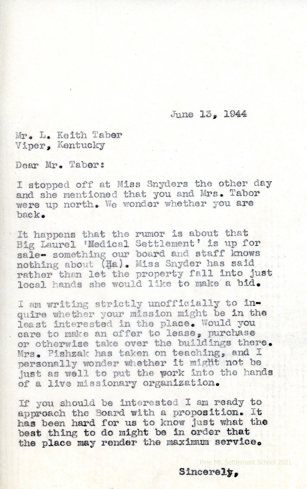 025 June 13, 1944. To Mr. L. Keith Taber, Viper, KY, from (truncated page), asking if his missionary organization may be interested in Big Laurel Medical Settlement, which is up for sale. Miss Snyder will make a bid; “Mrs. Pishzak has taken on teaching.”