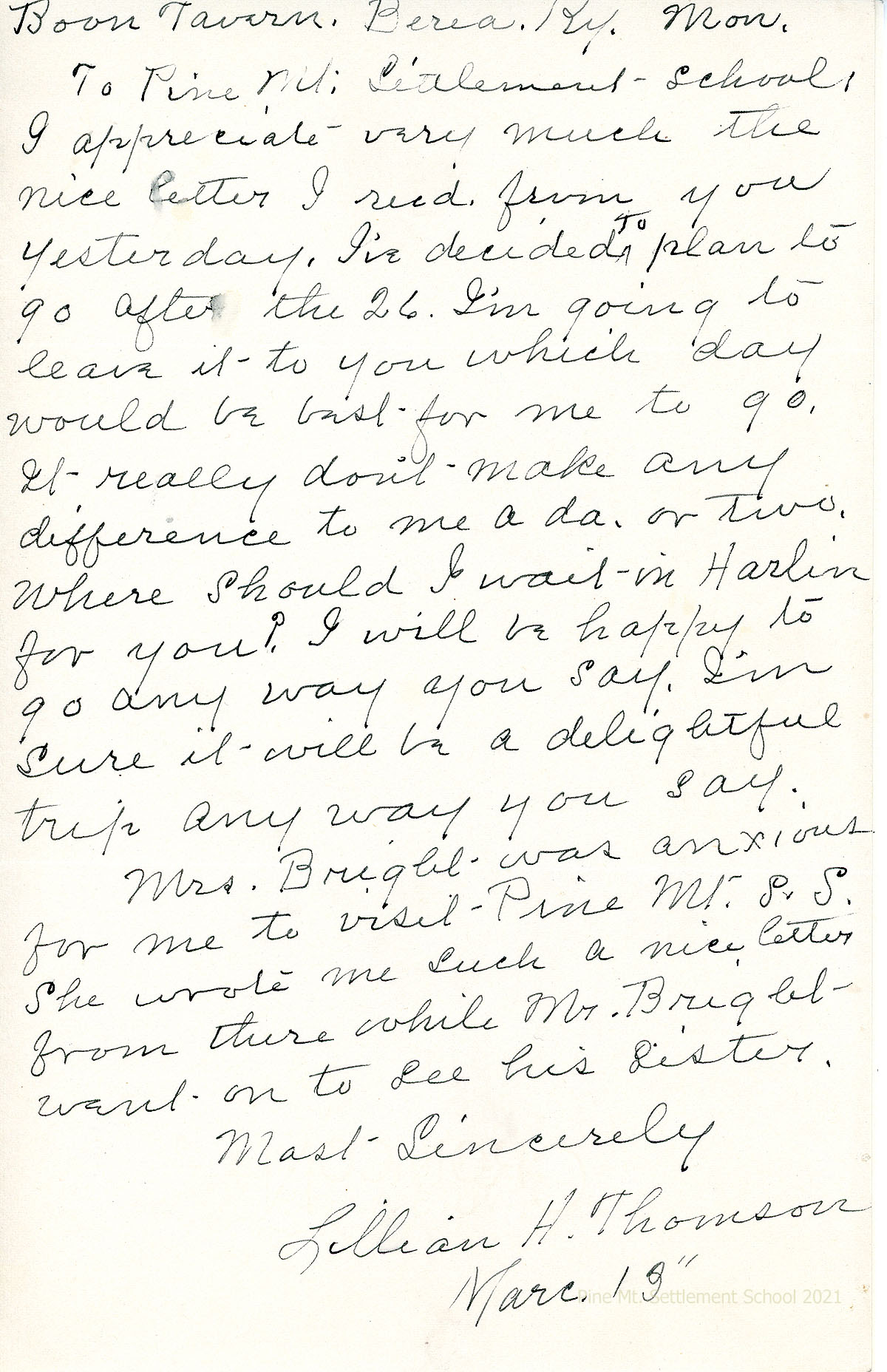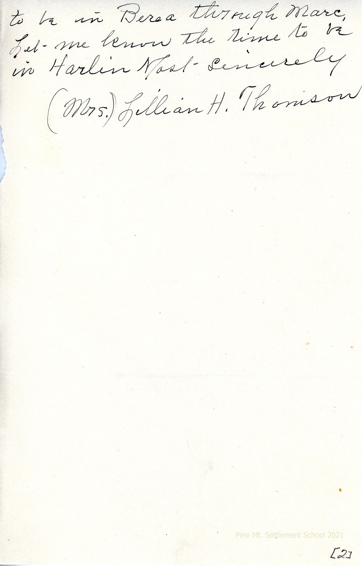030-030a February 28, 1944. Two-page handwritten letter to “the Sec. of Pine Mt. Settlement School “ from Mrs. Lillian H. Thomson, Boon(e) Tavern, Berea, KY. Inspired by a showing of PMSS pictures at Berea by Miss Alice Cobb, Thomson asks to visit PMSS for a week in March.