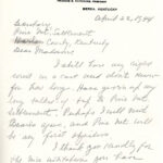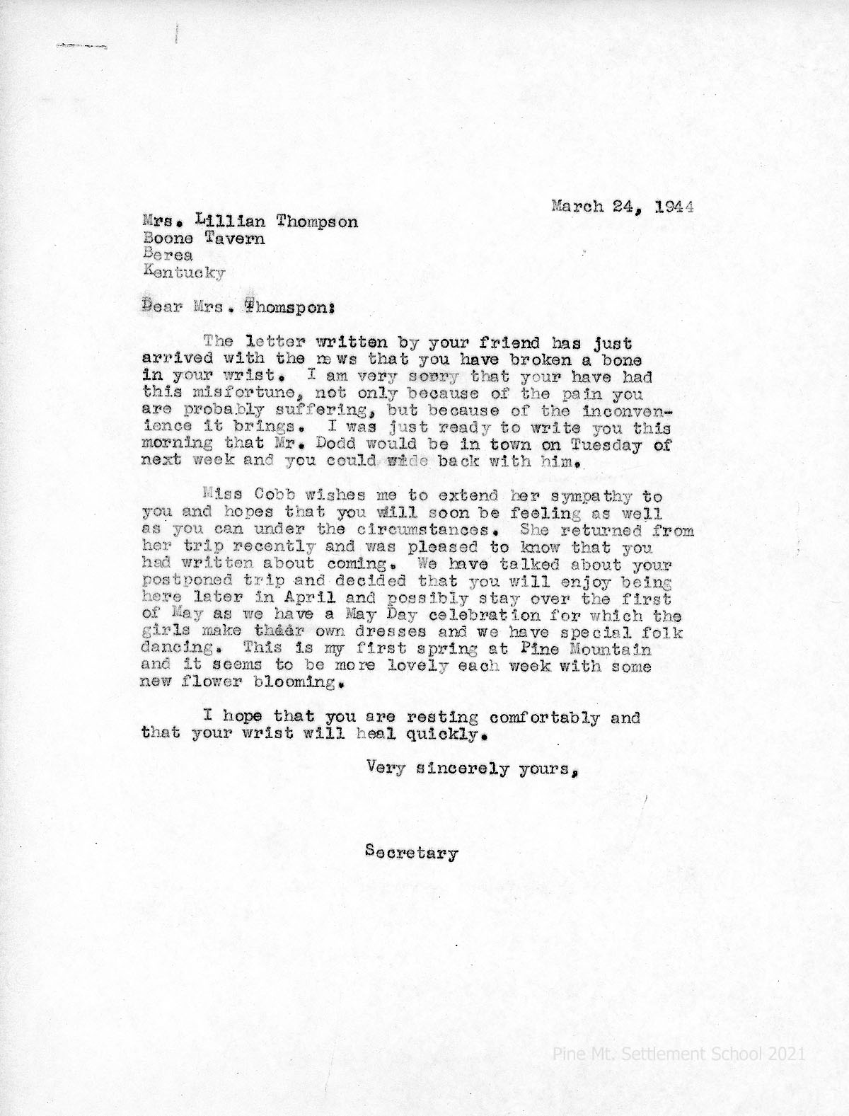 035 April 22, 1944. To Secretary, Pine Mt. Settlement, from Mrs. Thompson on Boone Tavern letterhead, Berea, KY. She still has a cast on her right wrist and has “given up my long talked-of trip to Pine Mt. Settlement,” unless she visits Berea again.
