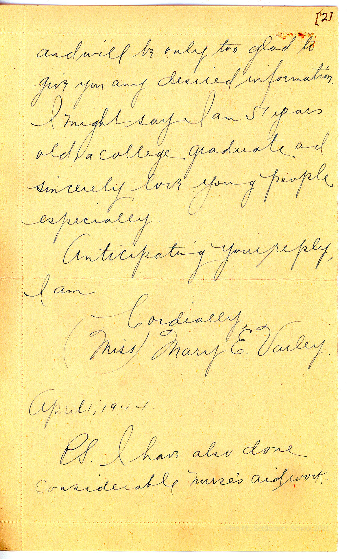 045-045a April 1, 1955. Two-page handwritten letter to “Gentlemen,” PMSS, from Miss Mary E. Varley, Longmeadow, MA, who is looking for a summer teaching position. She is 51 years old and a college graduate; has done nurse’s aid work.