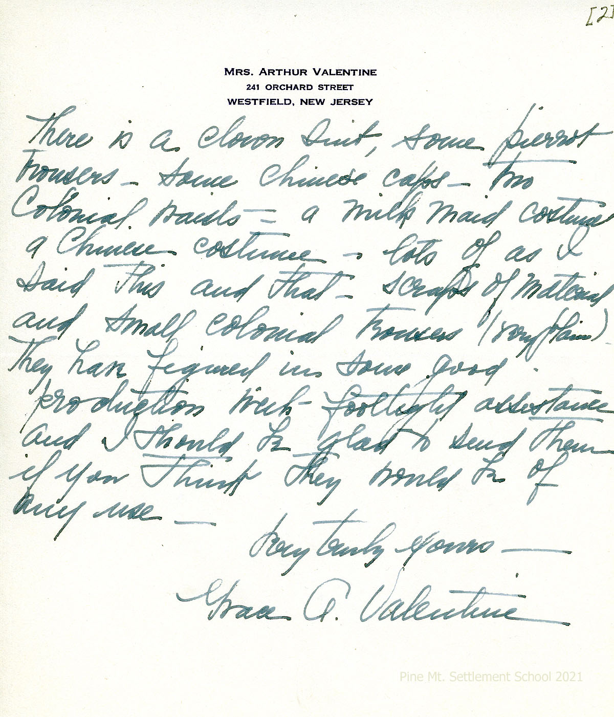 047-047a July 4, 1944. To “Dramatic Director, Pine Mt. School” from Mrs. Arthur (Grace A.) Valentine, Westfield, NJ, asking if she could send an “assortment of this and that” which her daughter collected when teaching dramatics in a private school (and now has a “war job”). She describes the costumes.
