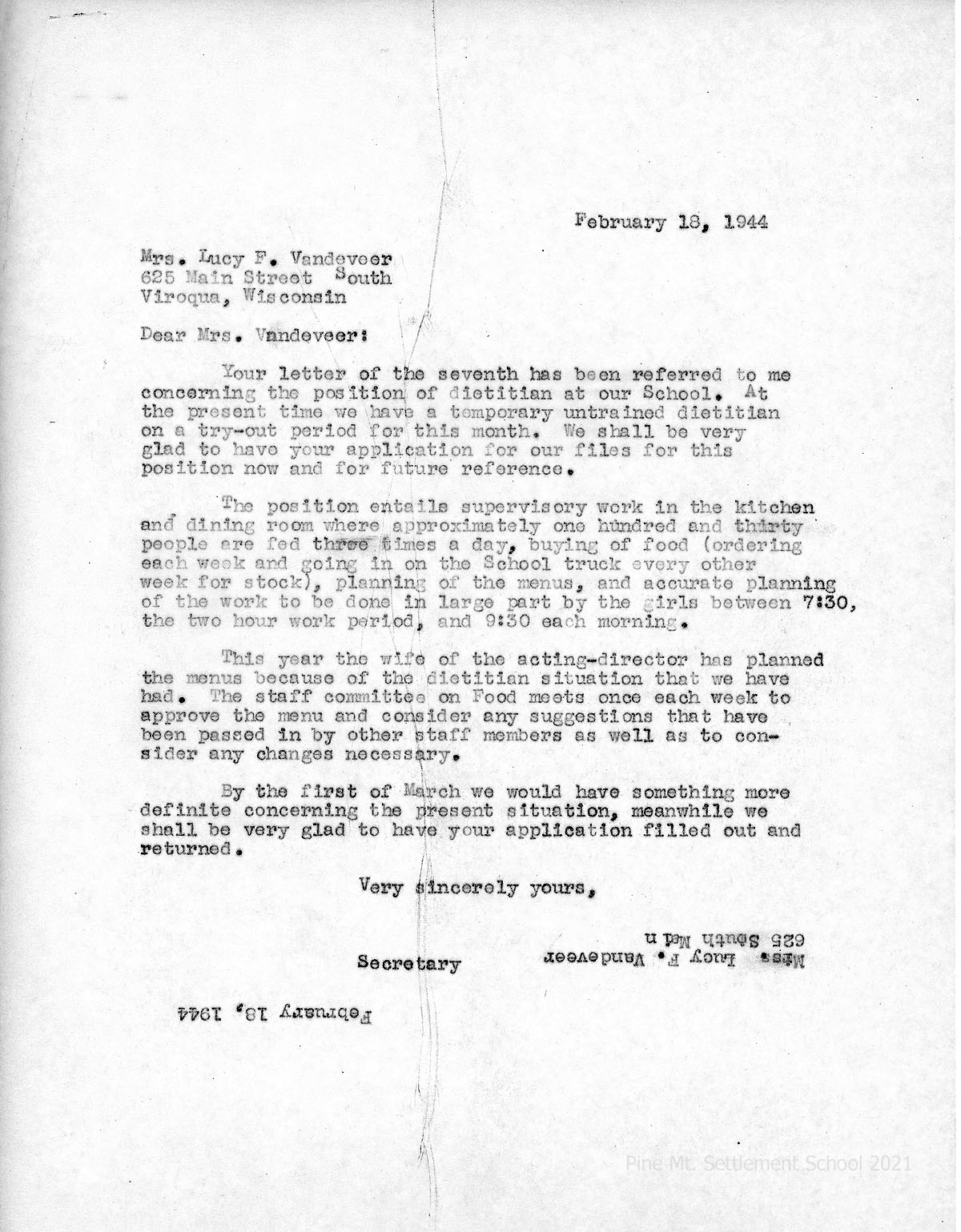 050 February 18, 1944. To Mrs. Lucy F. Vandeveer, Viroqua, WI, from (unsigned), Secretary, responding to Vandeveer’s inquiry about a dietitian position. Describes the duties of the position. “This year the wife of the acting-director has planned the menus…” which are approved by the staff committee on Food” Suggests that Vandeveer send in her application for PMSS office files.