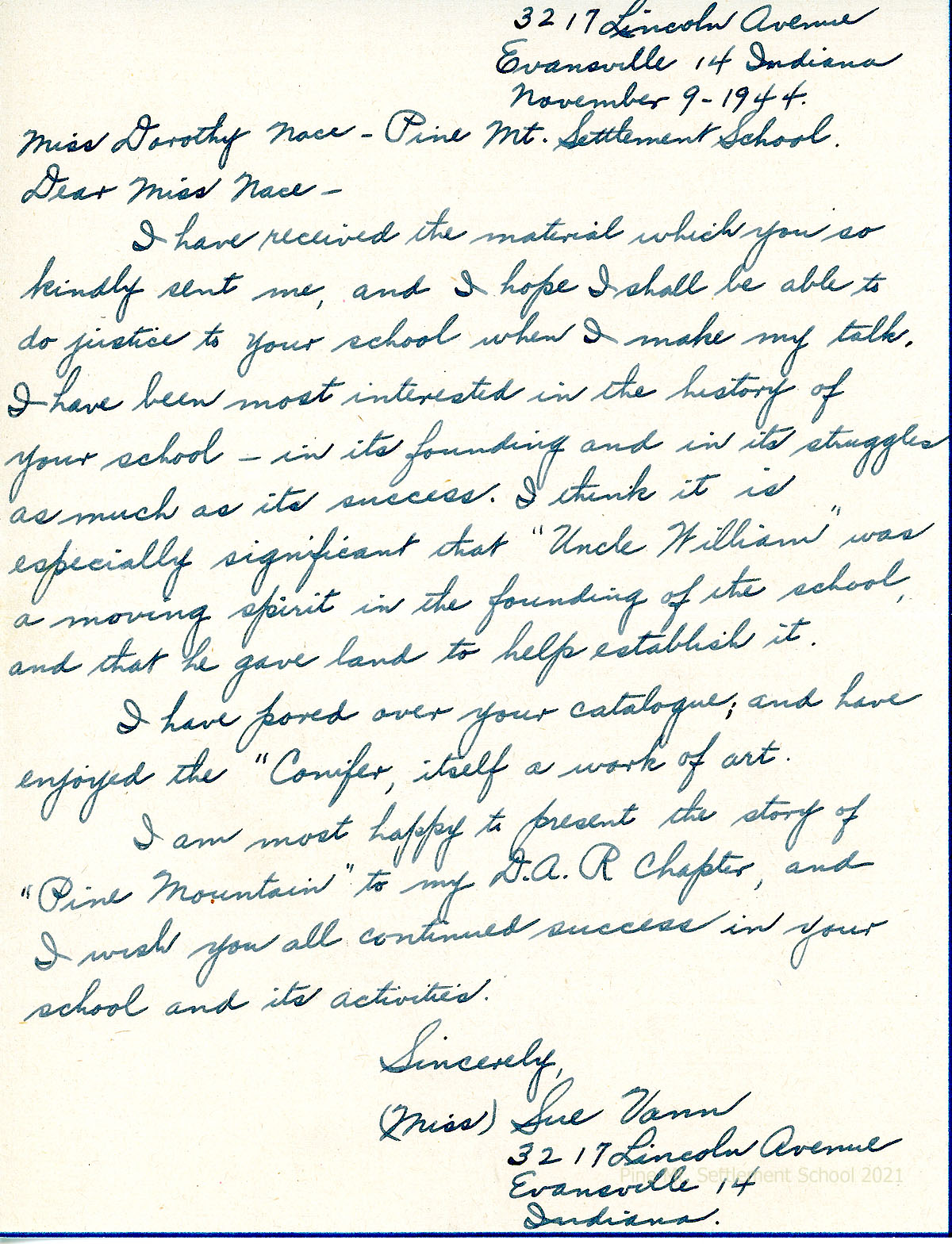 052 November 9, 1944. To Miss Dorothy Nace from Miss Sue Vann, Evansville, IN, thanking her for sending the material for her talk about PMSS to her DAR Chapter.